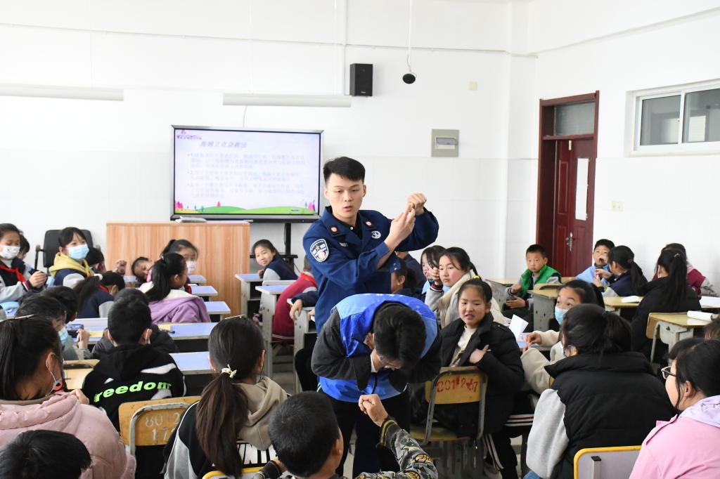 活动分为室内安全知识科普与室外消防装备实操两个板块。安全知识科普期间,“青春119”宣讲员付文雨采用风趣幽默的语言为小学生讲授防溺水知识,通过视频向同学们科普自救互救方法。同时,也向同学们讲解了海姆立克急救法,并与学生积极互动,现场指导学生使用海姆立克急救法。