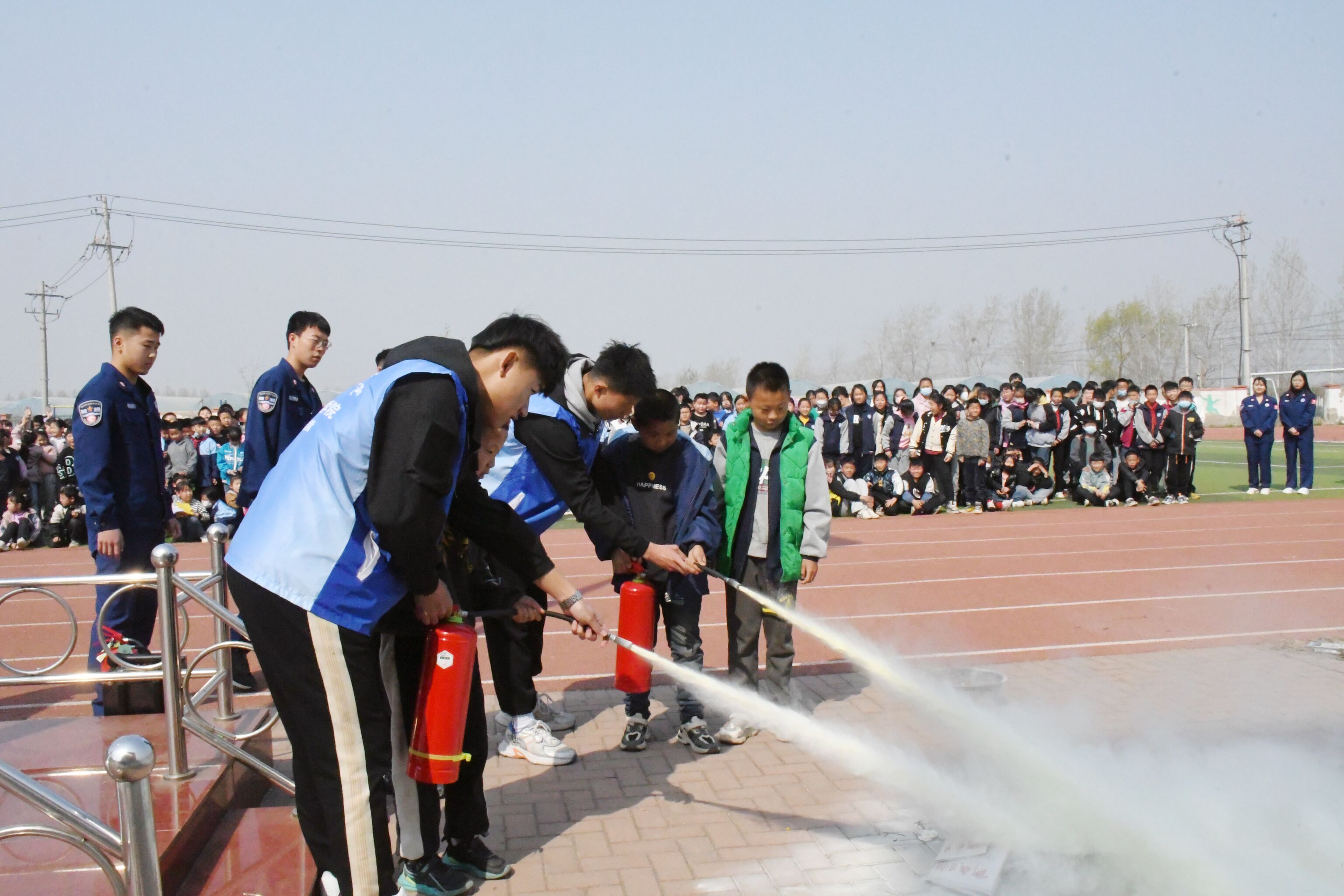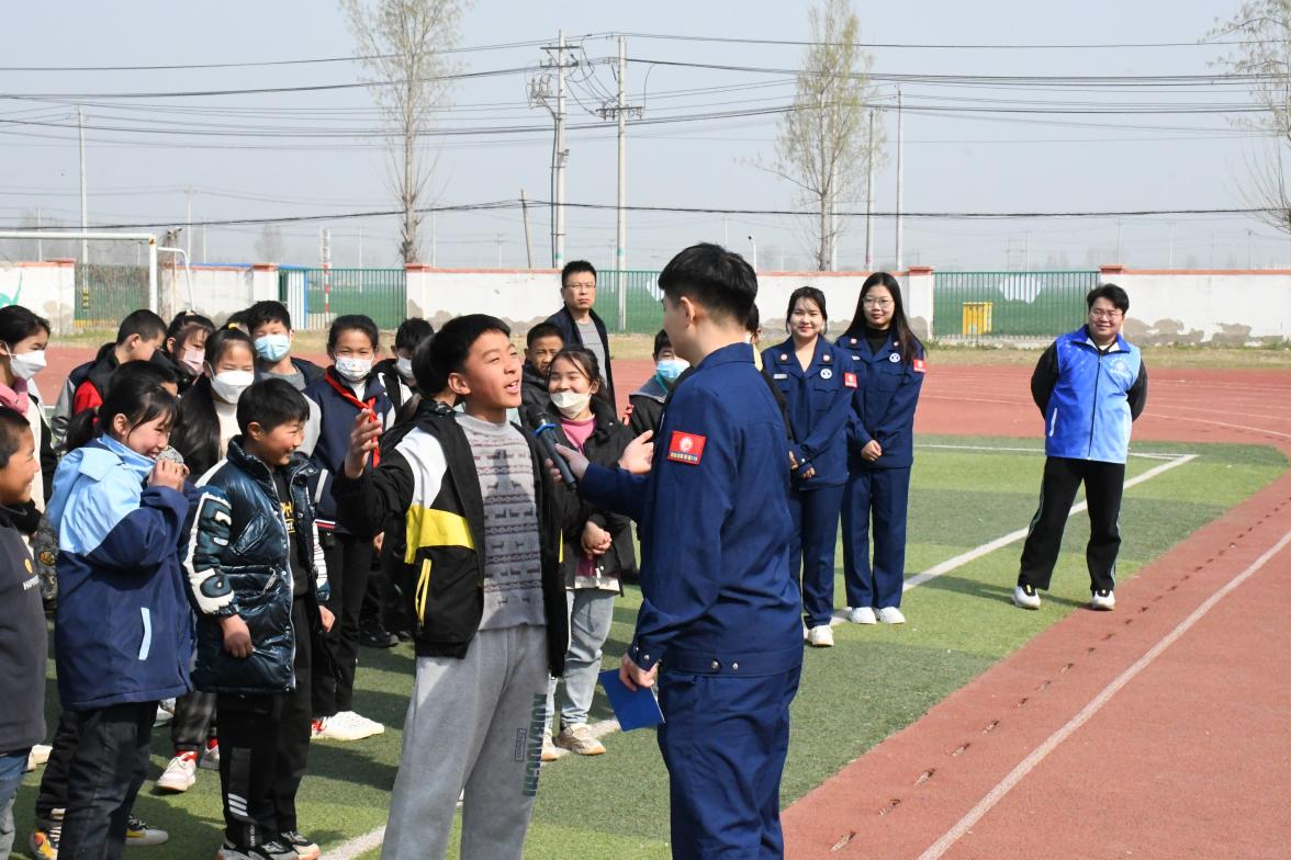 安全知识科普结束后,队员们带领学生来到学校操场进行消防装备的现场实操。队长刘松对火灾发生时如何逃离火灾现场,如何做好防护等知识进行详细讲解,并与同学们开展“消防安全知识问答”等互动小游戏。