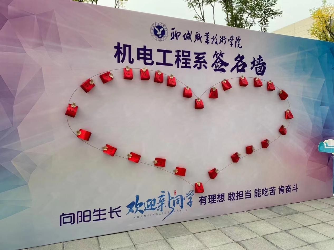 新生报到处设置“欢迎新同学”的签到背景墙以及“亲,机电工程系等你很久了”“我们如约而至 定当不负韶华”“立志技能报国 打造国之重器”等欢迎标语,让新生与家长感受到聊职人的热心热情,激励新生蓬勃向上、奋勇争先。