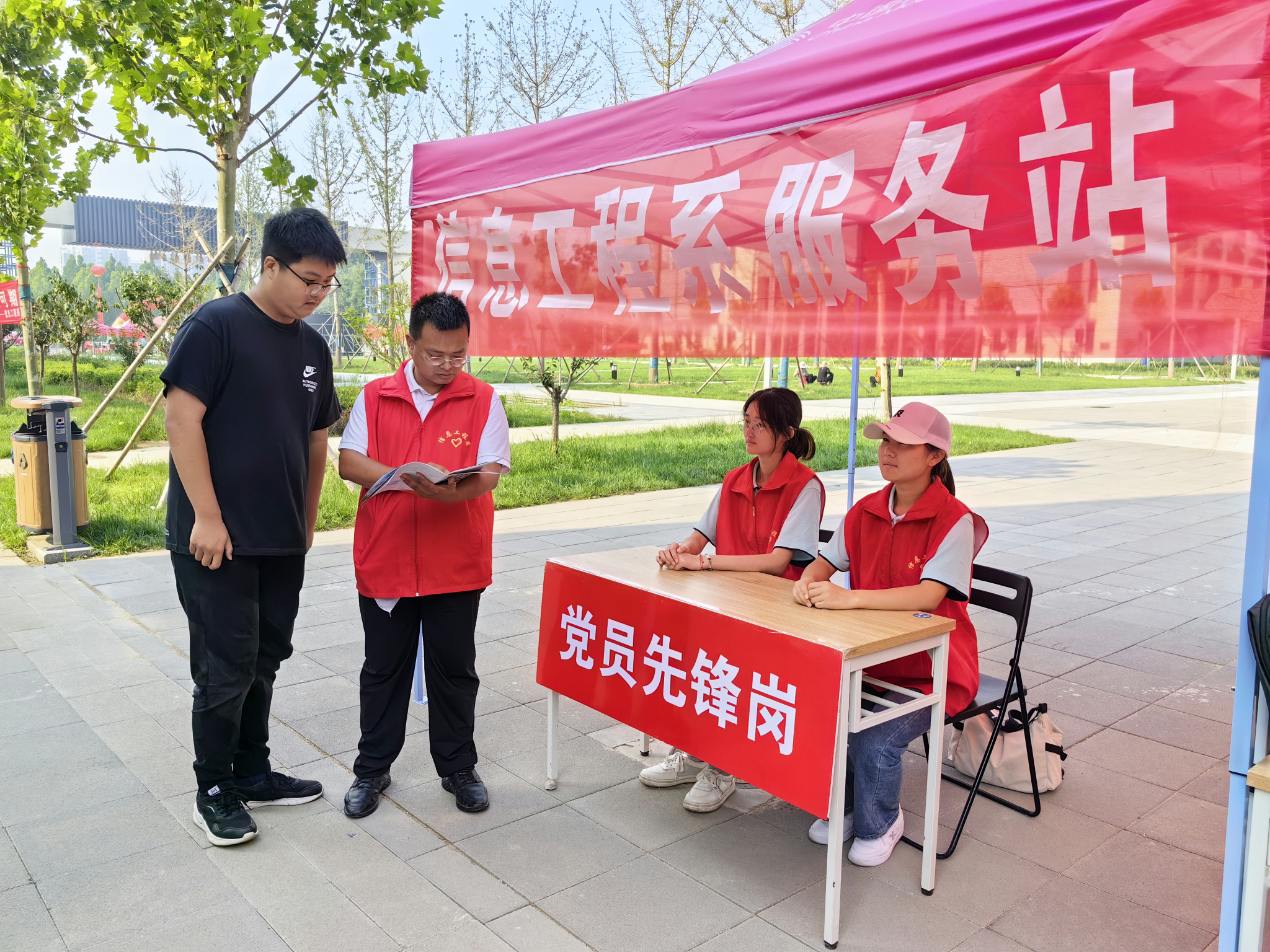 党建引领聚合力。在迎新现场特别设立了党员服务岗,党员教师带领入学积极分子们成立了“党员服务站”,在迎新过程中积极参与到新生服务当中,为新生解答各种疑惑,发挥党员的先锋模范带头作用。