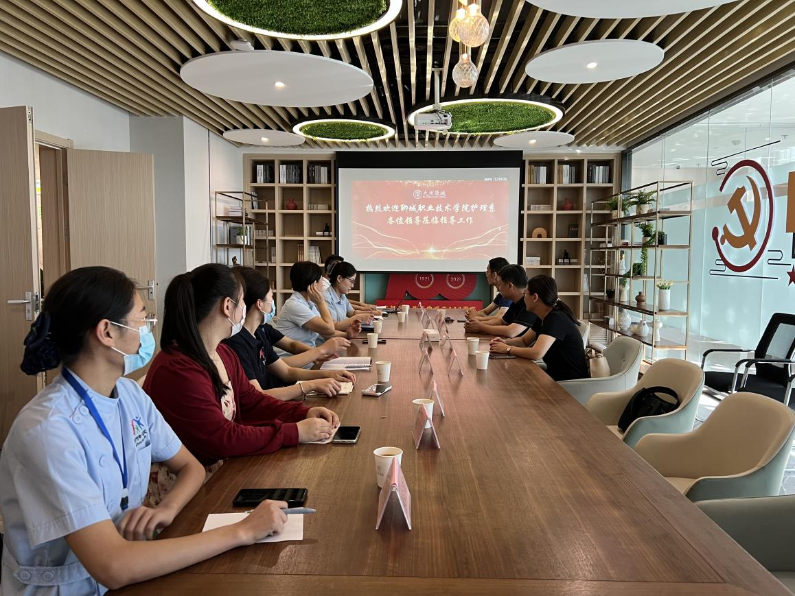 校企双方进行座谈,九州康城人力经理刘广亭、幸福家项目经理张平、护理院院长林凤玲以及在九州康城就业的护理系毕业生代表参加座谈会。刘营详细介绍了此次企业考察调研的目的、护理系康养类专业设置和毕业生情况。双方就岗位人才需求、智慧健康养老服务与管理和健康管理专业人才培养、基于岗位需求的课程体系设置、见习实习基地建设等方面进行了深入交流,为解决学生实习、就业奠定了良好的基础。
