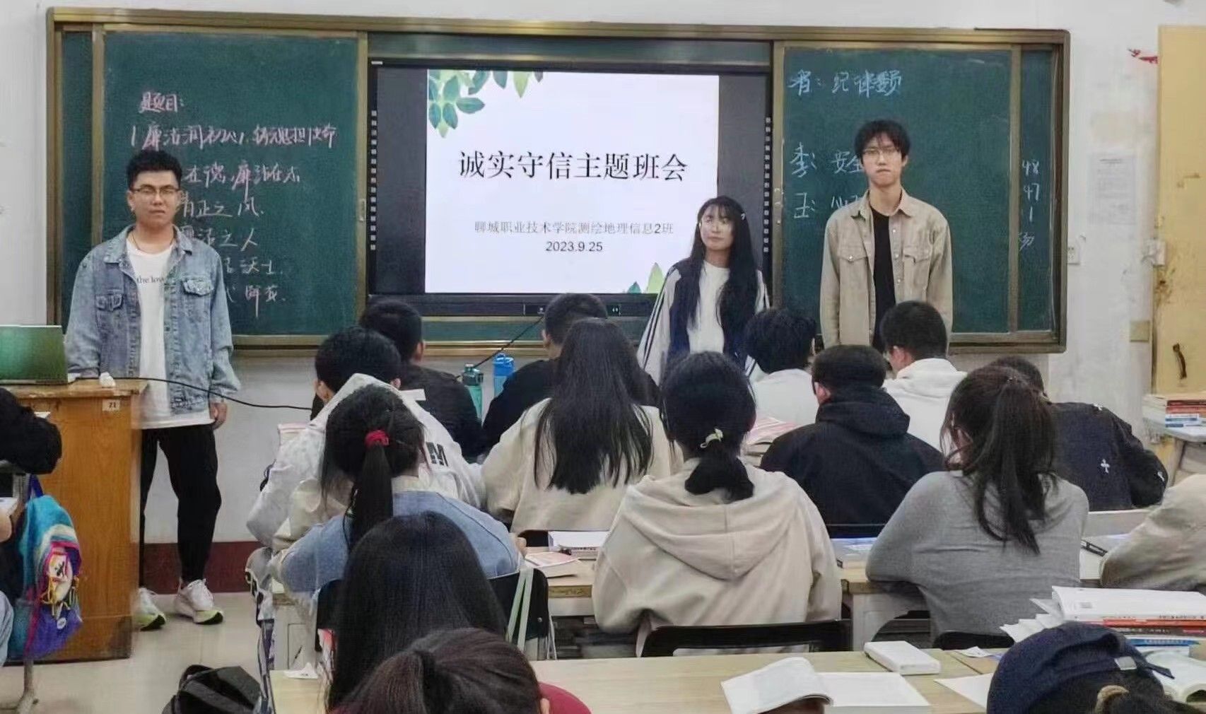 弘扬廉洁新风,营造诚信守法班级环境。各班级在辅导员、班主任、学生干部的引领下,以“诚信守法”为主题,围绕学习生活过程中的到课情况、课业作业、贫困生认定、助学金申请等方面进行自检,开展批评与自我批评,查找可能存在的诚信问题,探讨大学生在学习生活中如何做到明礼诚信。
