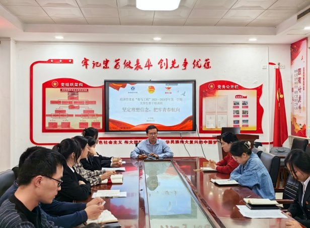 为贯彻落实党的二十大精神,为党培养信仰坚定、能力突出、素质优良、作风过硬的青年政治骨干,11月9日,经济管理系举行2023-2024学年第一学期“青马工程”第四次培训。本次培训由王学强主讲,经济管理系全体辅导员及50余名学生骨干参加培训。