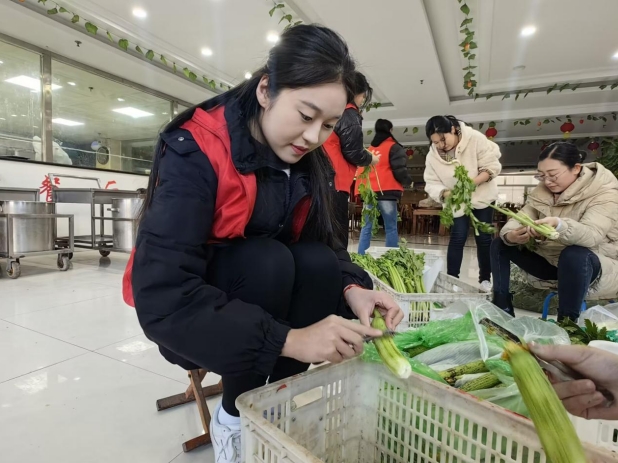 在养老院后厨,志愿者们从食材原材料开始,分工协作,有条不紊,洗菜、择菜、包饺子一气呵成。志愿者们还向鸿福老年公寓的食堂工作人员学习包了花卷和窝头。活动中,同学们用热情和耐心感染着养老院的老人们和社区工作人员,获得了一致认可和赞赏。
