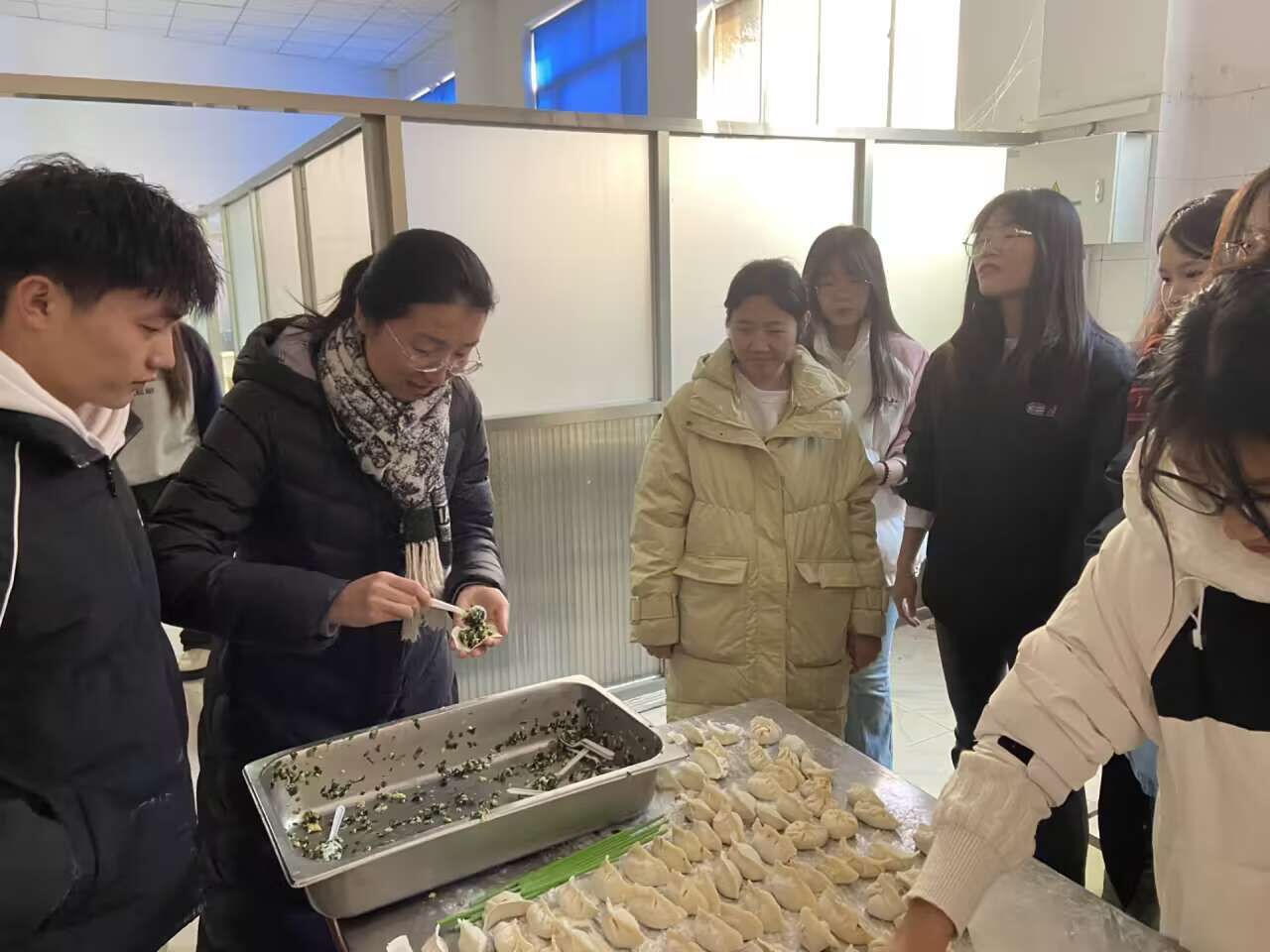 活动中,大家各司其职,配合默契,和面、擀皮、拌馅,在欢乐温馨的气氛中,一个个形态各异的饺子也闪亮登场。老师一边和同学们包饺子,一边亲切地围绕学习、生活、未来规划等话题展开交谈,大家有说有笑,现场其乐融融。