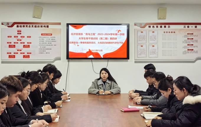 12月29日,经济管理系开展“青马工程”2023-2024学年第一学期大学生骨干培训班(第二期)第四讲。经济管理系团总支书记奚源、全体辅导员及40余名学生骨干参加培训。