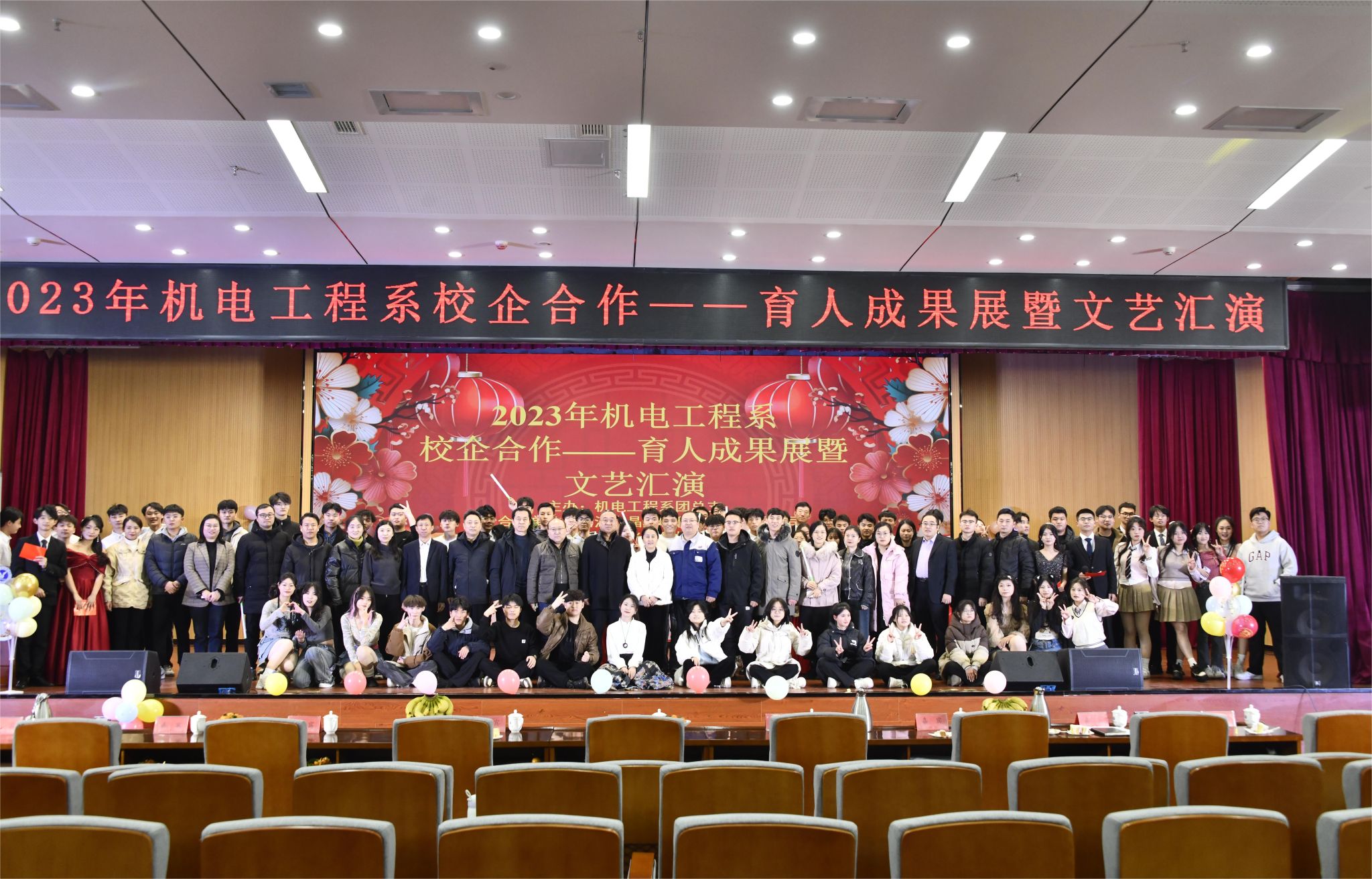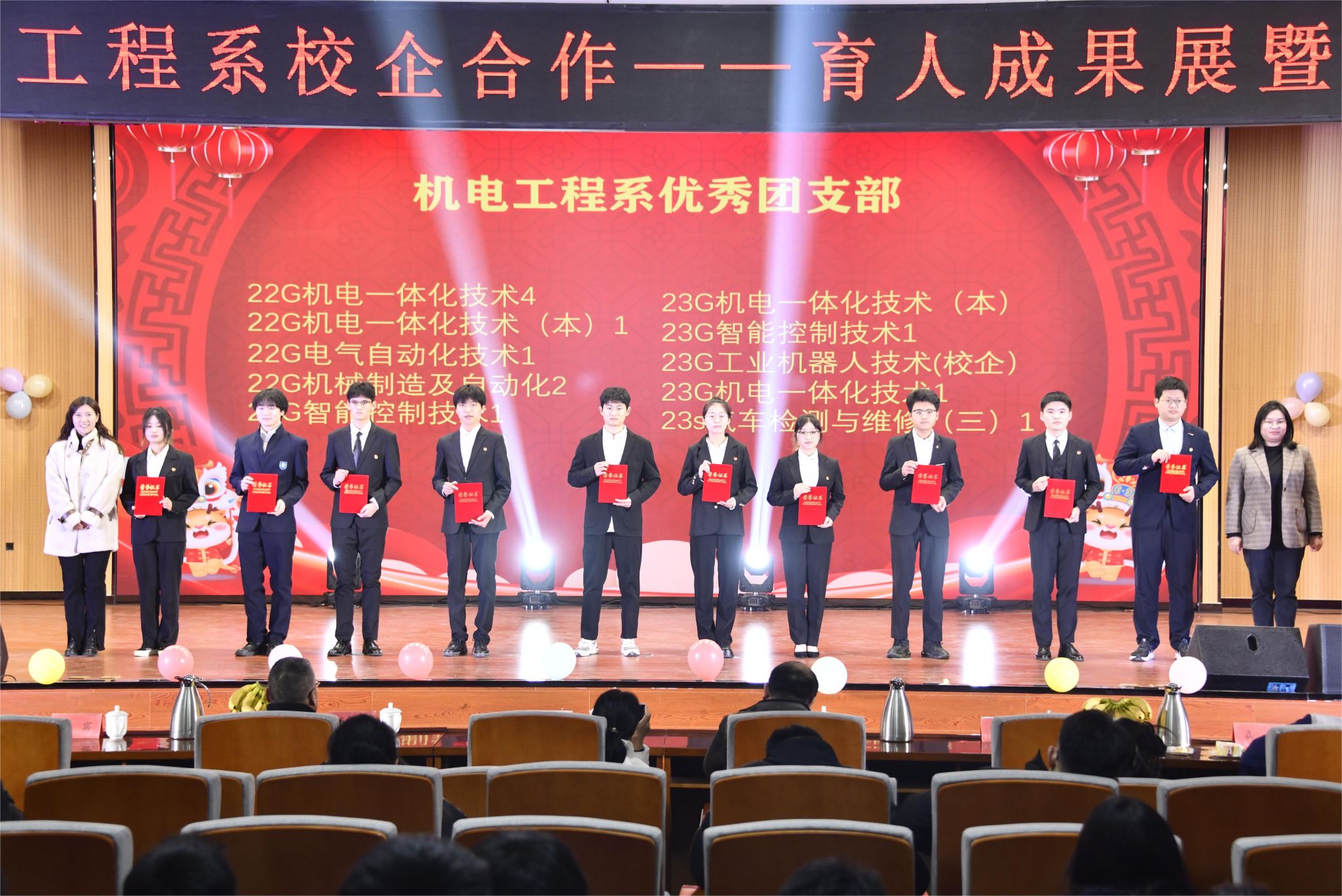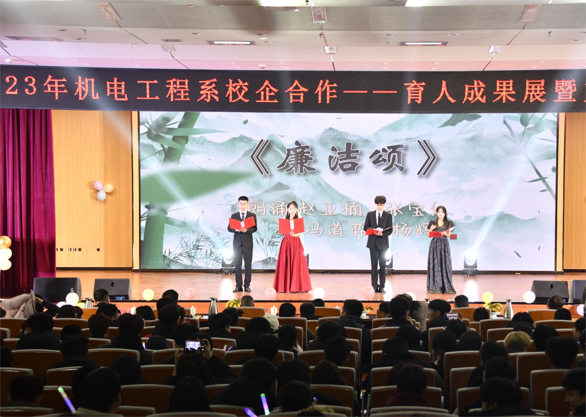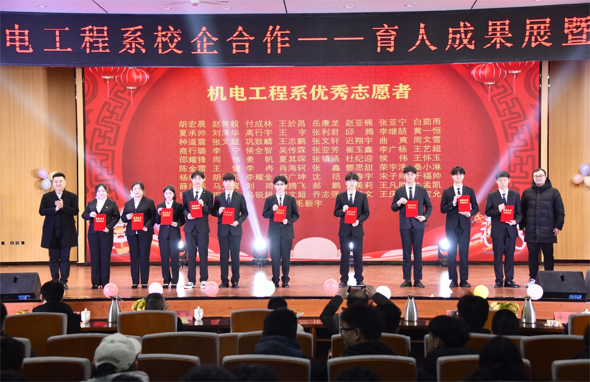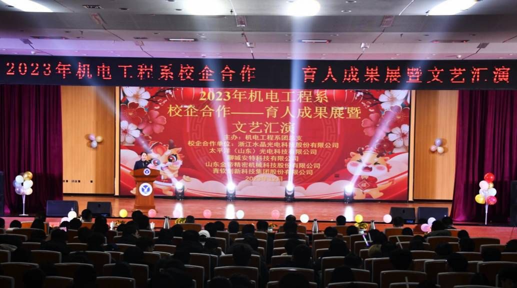 12月28日,机电工程系举办2023年校企合作育人成果展暨2024年元旦文艺汇演。聊城安特科技有限公司董事长张希民,聊城市博源节能科技有限公司人力资源总监吕霞,青软创新科技集团股份有限公司聊城基地运营总监张龑,太平洋光电科技有限公司总经理助理岳才堂,校学工部学生管理与服务科科长李宇潇,校团委副书记张博文,校团委办公室副主任徐雪彤,创新创业中心副主任王冉,学工部吴倩、高文雯、姜燕,机电工程系党总支书记、系主任张凤军,系党总支副书记任伟,系综合科副科长孙国强,系团总支副书记赵荣荣,辅导员、班主任、企业职工代表及300余名学生代表参与本次活动。