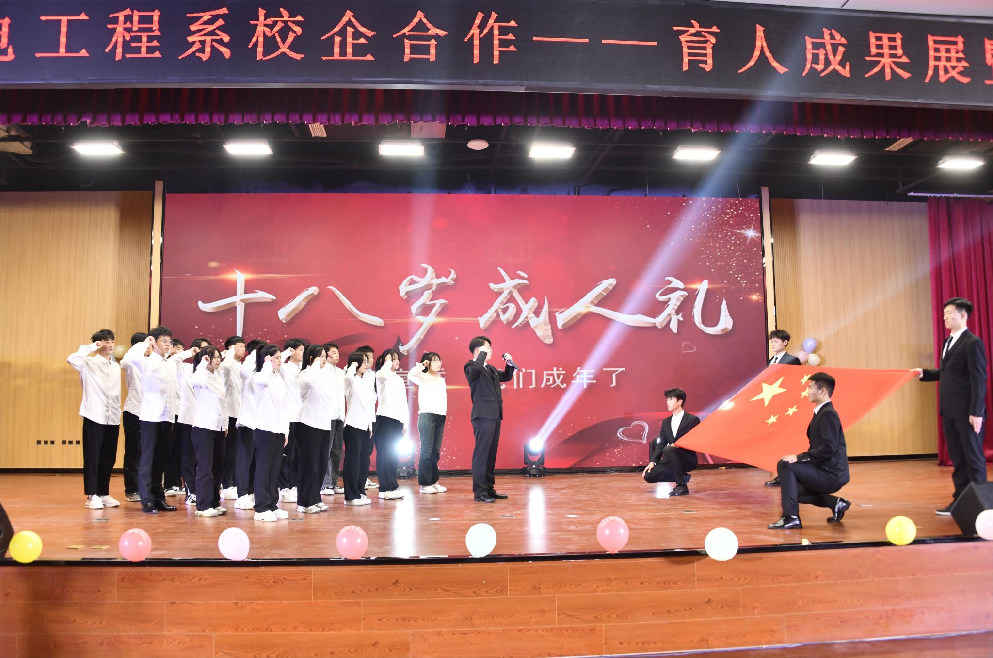 现场特别设置了“成人礼”环节。此前面向全系征集了刚满18岁的30余名学生的成长照片,制作成暖心VCR在现场播放,并邀请他们上台同唱生日歌,切巨型蛋糕,共同仰望五星红旗,立下无悔的誓言,将现场气氛推向高潮。
