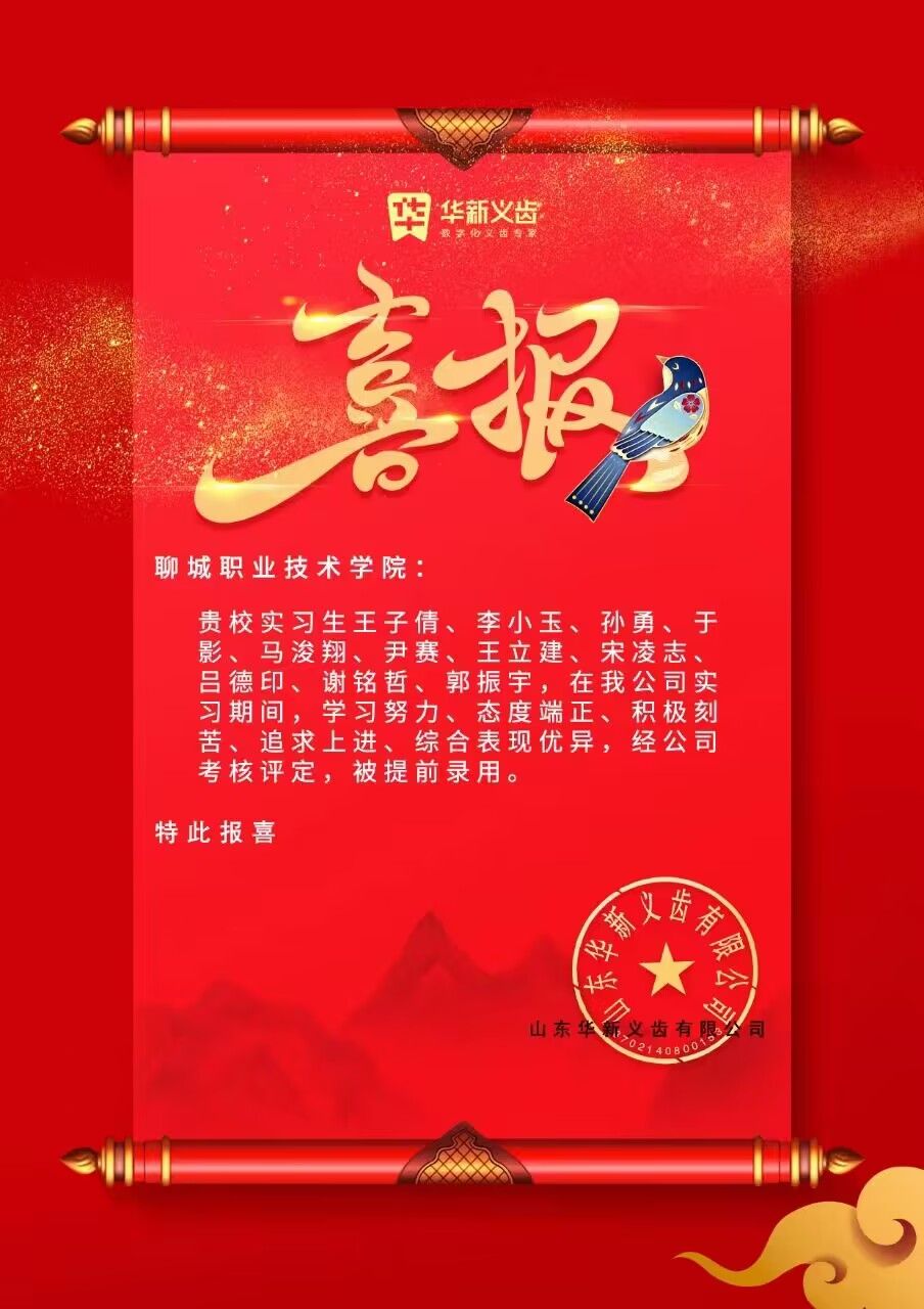 1月25日,山东华新义齿有限公司向我校发来喜报。医学系口腔医学技术专业实习生王子倩、李小玉等11名同学在实习期间表现优异,经公司考核评定,被公司提前录用。