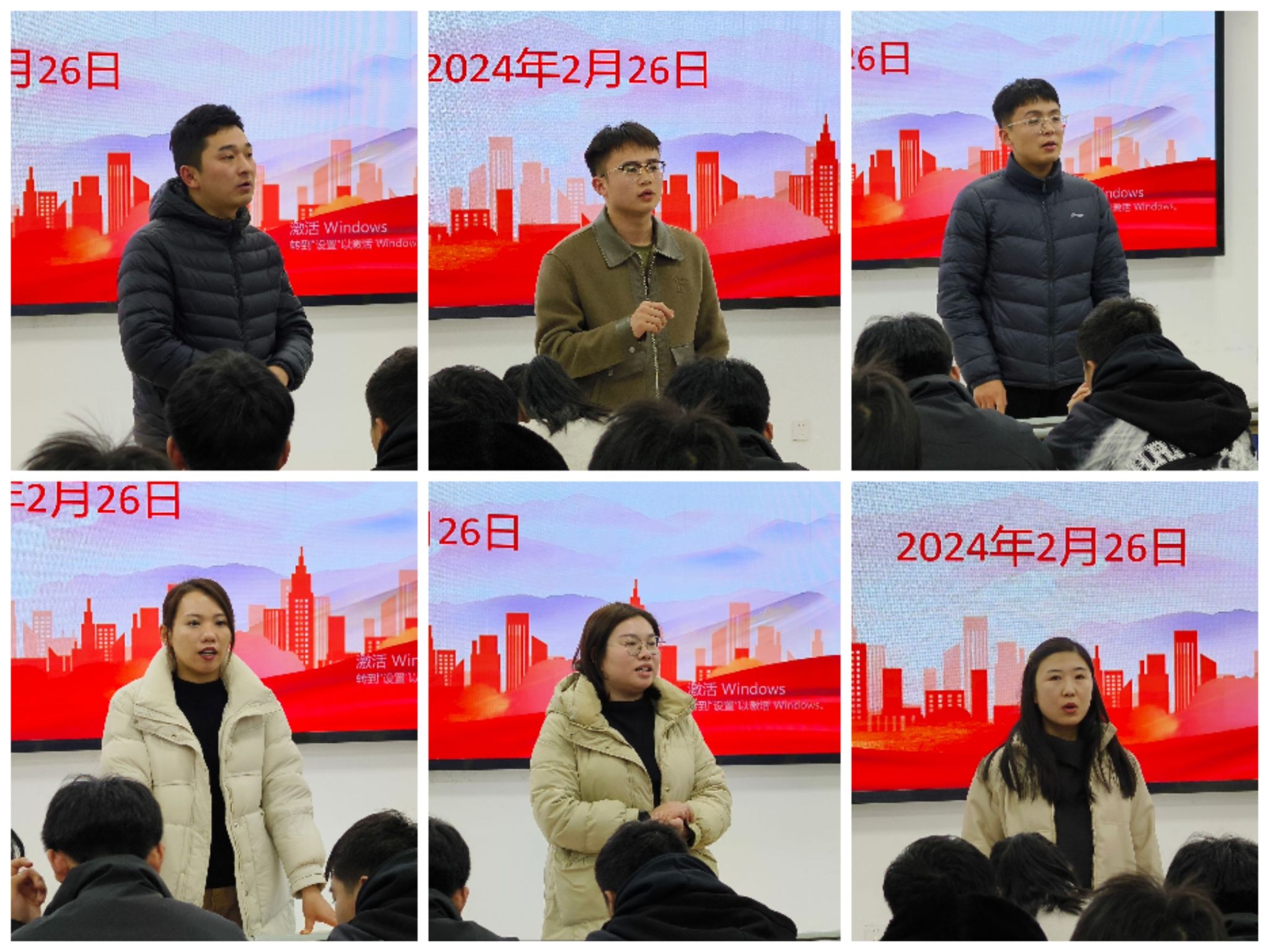 辅导员根据自身分管工作,对学生进行思政引领、学业指导、能力提升等方面的培训。赵荣荣讲解学生干部如何进一步提升综合素质,希望大家以身作则,注重创新意识的培养,不断改进工作方式方法;谢兵锐重点强调了纪律问题,希望学生干部发挥带头作用;王凤瑞强调了宿管会的工作方式方法及学生宿舍安全问题;孙小寒对同学们参与志愿服务以及社会实践寄予厚望,引导学生提升志愿服务意识;袁建正强调了大学生增才干、稳就业的重要性;胡洋洋重点强调了大学生的创新意识培养;徐红岩关注同学们的心理健康状况和思想健康状况,强调了心理普查的重要性和必要性。