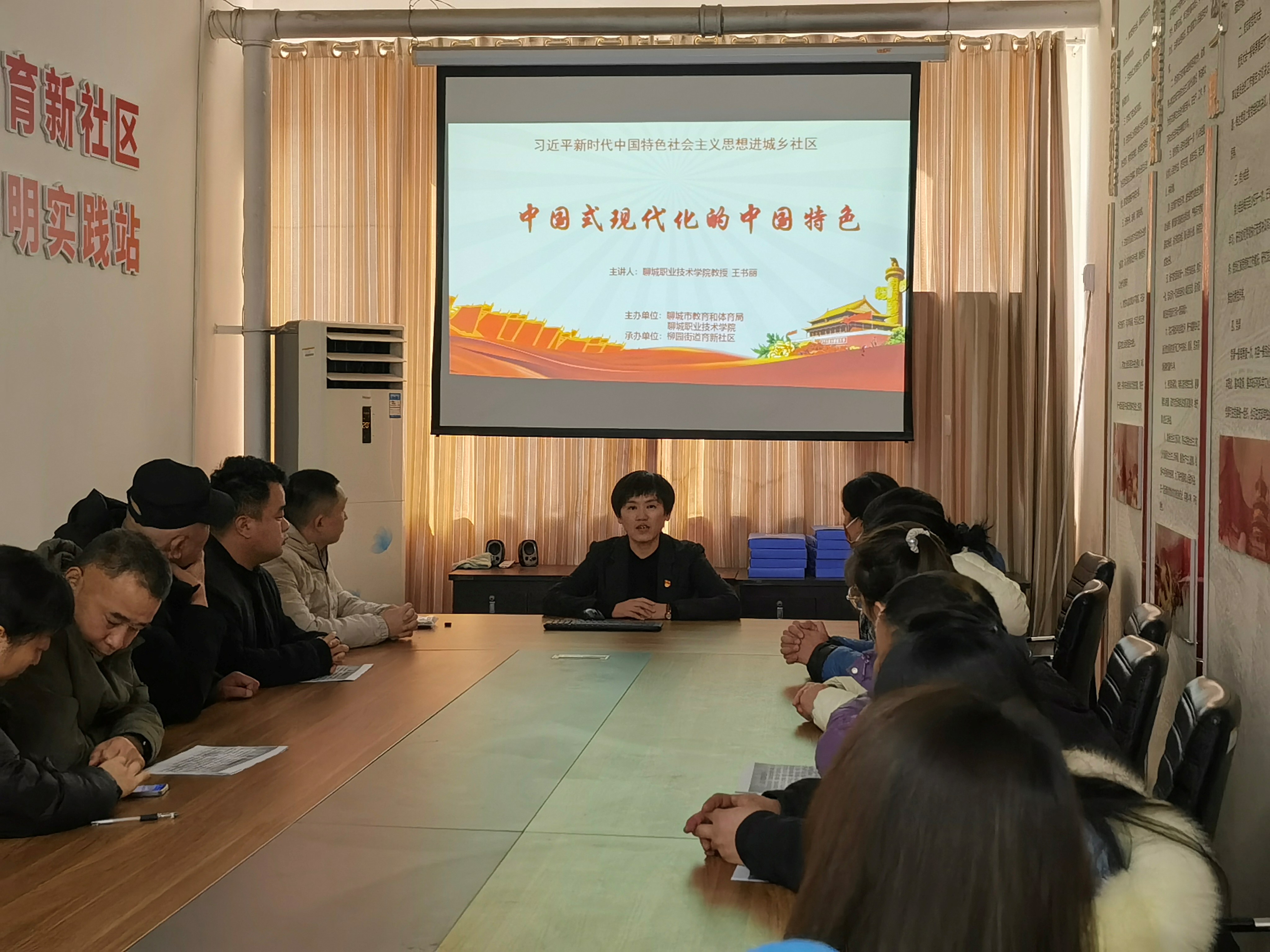 马克思主义学院王书丽教授为街道辖区老党员、社区干部讲授题为《中国式现代化的中国特色》的党课。她用通俗易懂的语言、生动详实的事例,从历史演进、五个特色、本质要求、重大原则四个方面详细介绍了中国式现代化的中国特色,深入讲解了习近平新时代中国特色社会主义思想,深刻阐释了中国化时代化的马克思主义为什么行的内在逻辑。