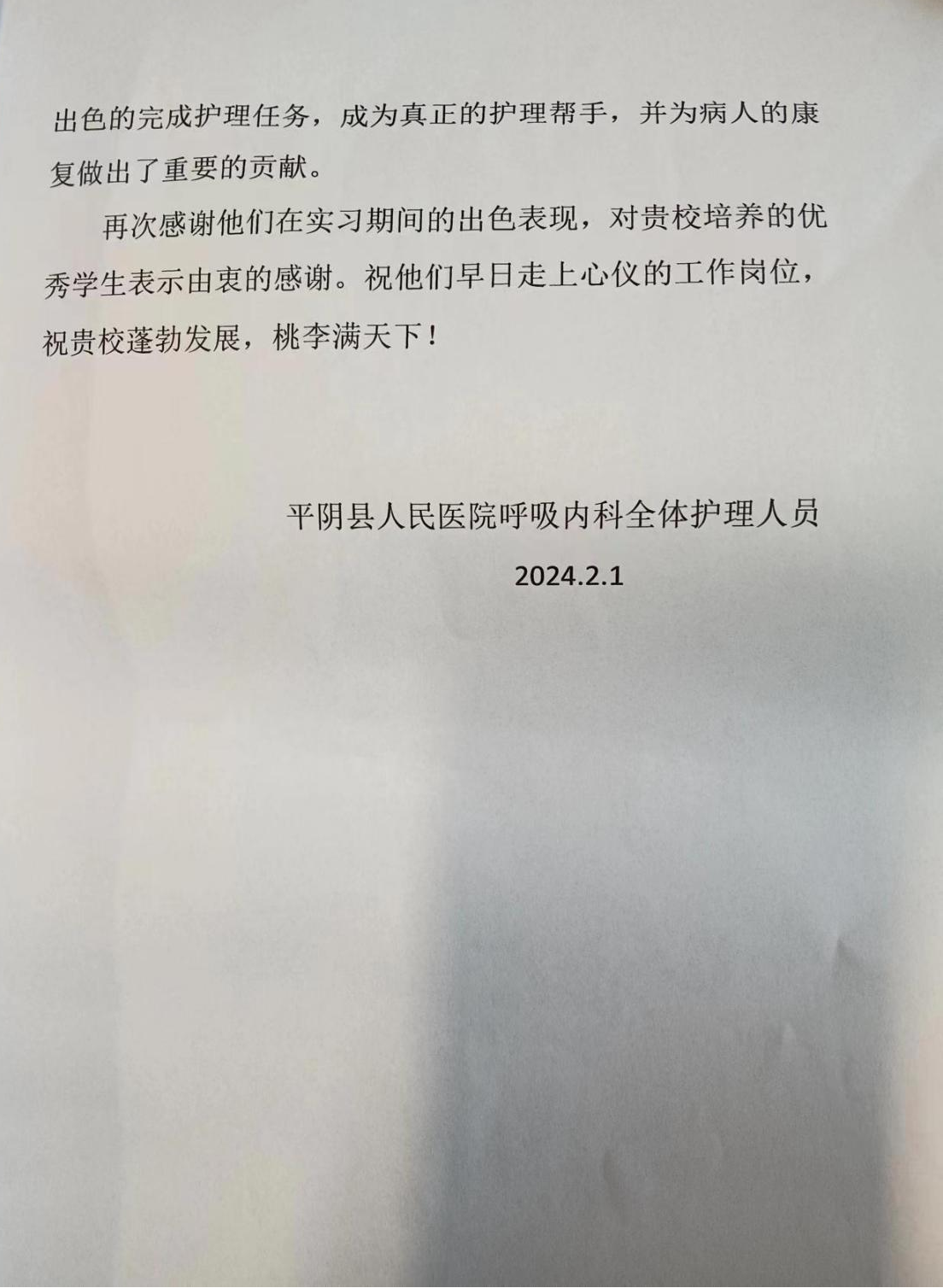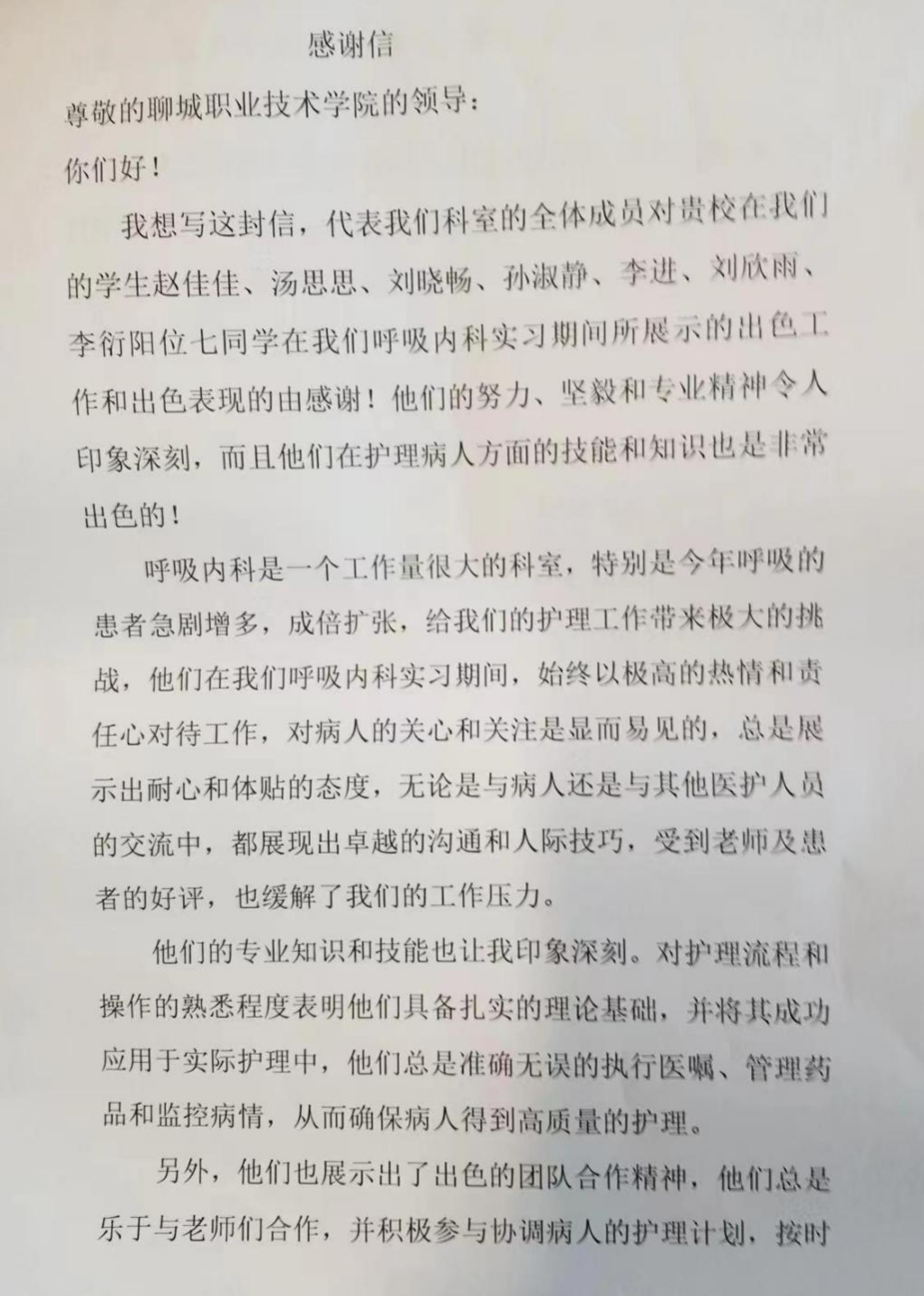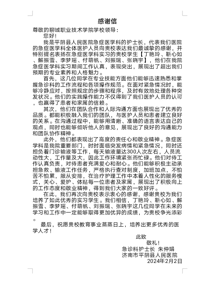 近日,聊城职业技术学院收到平阴县人民医院呼吸内科、急诊科的两封感谢信,信中高度赞扬了护理系实习学生在医院实习过程中的表现。信中写到,我校学生在实习期间工作认真,勤奋好学,耐心、细心地护理病患,熟练的实践操作能力不仅得到医护人员的认可,也赢得了患者和家属的信赖。