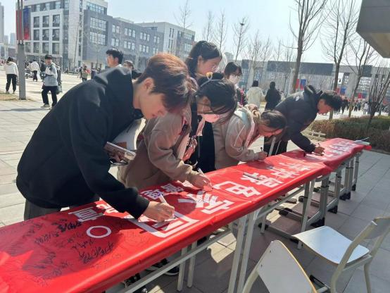 校园内,同学们广泛宣传“绿水青山就是金山银山”的生态保护理念,并在“共筑梦想之林,守护绿色家园”的条幅上郑重签下自己的名字和寄语,表示要积极响应生态保护号召,做传递绿色理念的践行者。