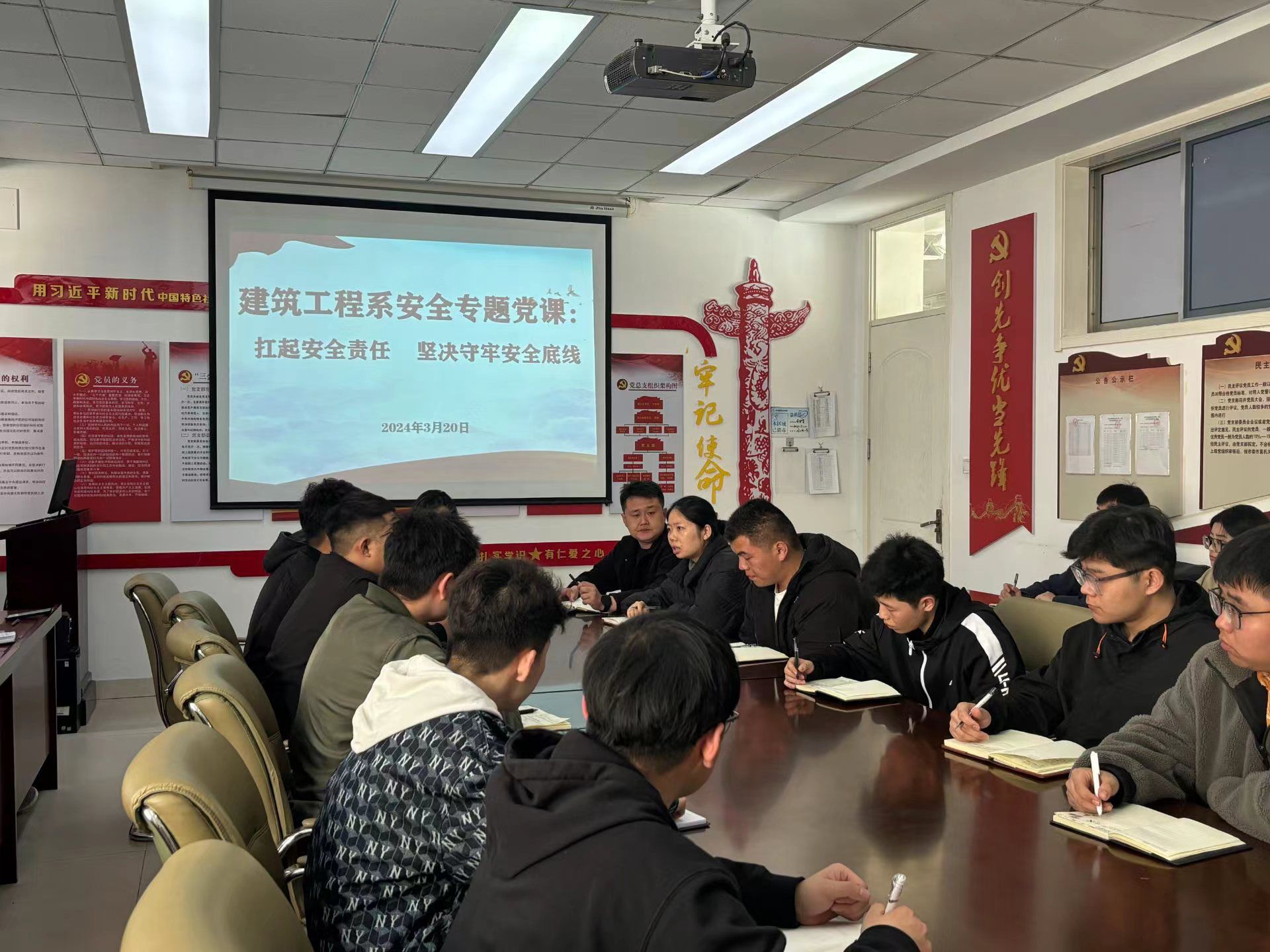 3月20日,建筑工程系党总支副书记邵琰以《扛起安全责任,坚决守牢安全底线》为题讲授专题党课。学生党支部全体成员和入党积极分子代表参加学习。