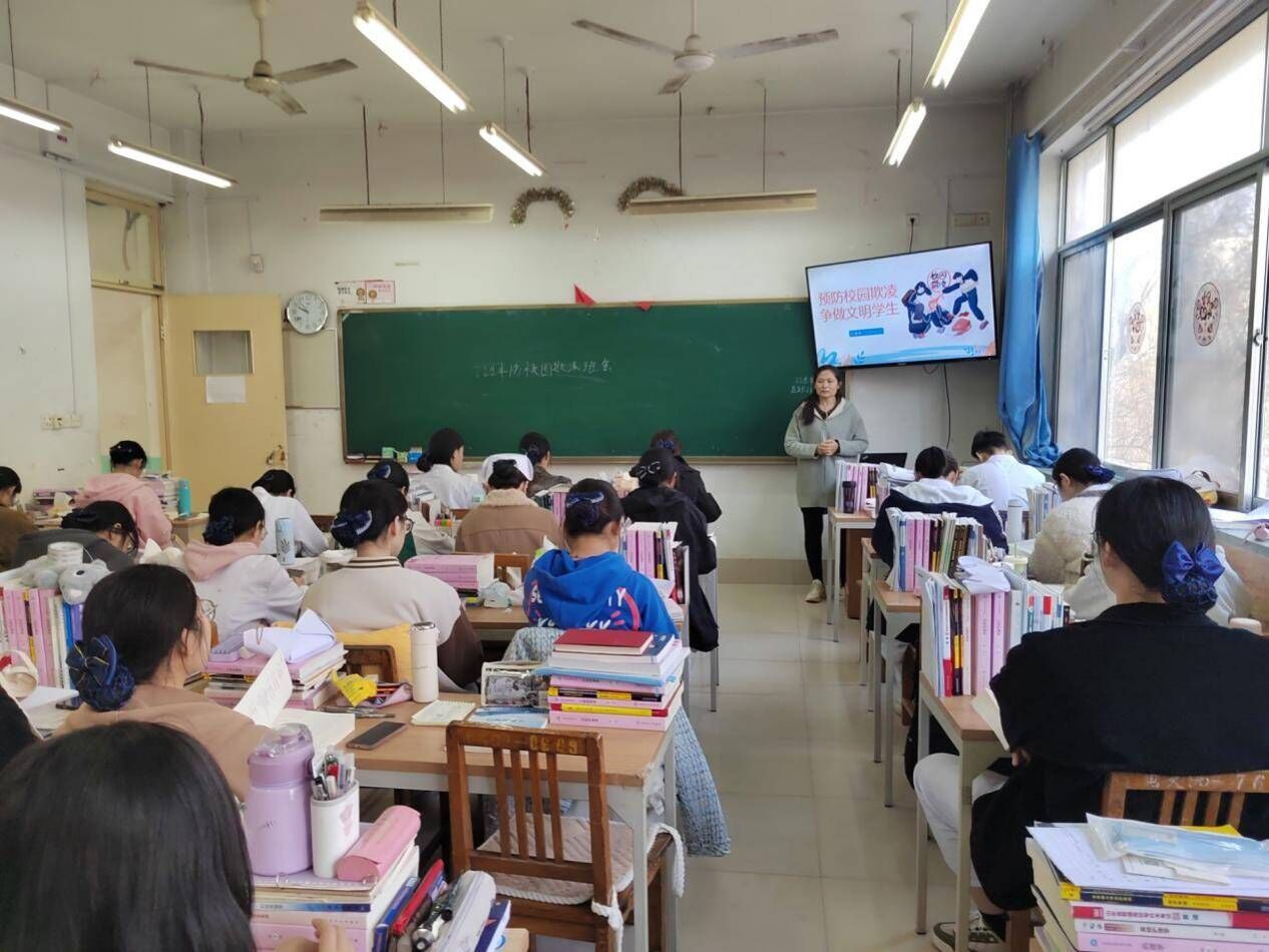 召开主题班会,加强法治教育。护理系各班级召开“预防校园欺凌,争做文明学生”主题教育班会,班主任结合近期发生的校园欺凌的典型案例,从校园欺凌的定义、危害、相关法律规范及应对措施等方面进行了安全教育和法治教育,引导学生养成良好的行为习惯,建立健康的人际关系。