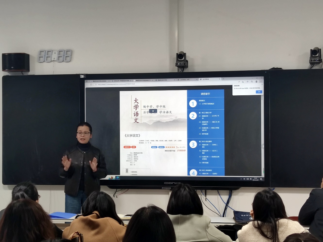 王书芬老师从实际出发,为大家展示了校级在线精品课程《大学语文》学习平台,播放平台视频,分享团队建课经验,提出各课程团队在建设课程时一定要注重团队的力量,团队成员要有协作精神、合作意识,只有团队成员齐心协力,才能发挥最大的价值。