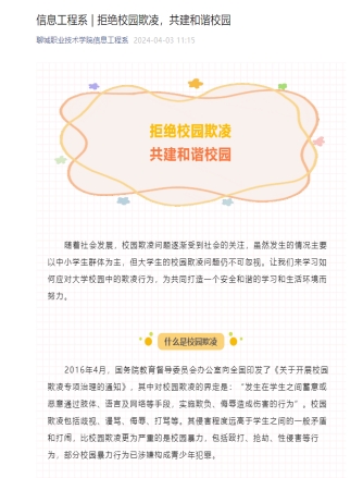 为增强学生的自我保护意识,构建文明和谐的校园环境,近日,信息工程系开展“预防校园欺凌,争做文明学生”主题教育活动。