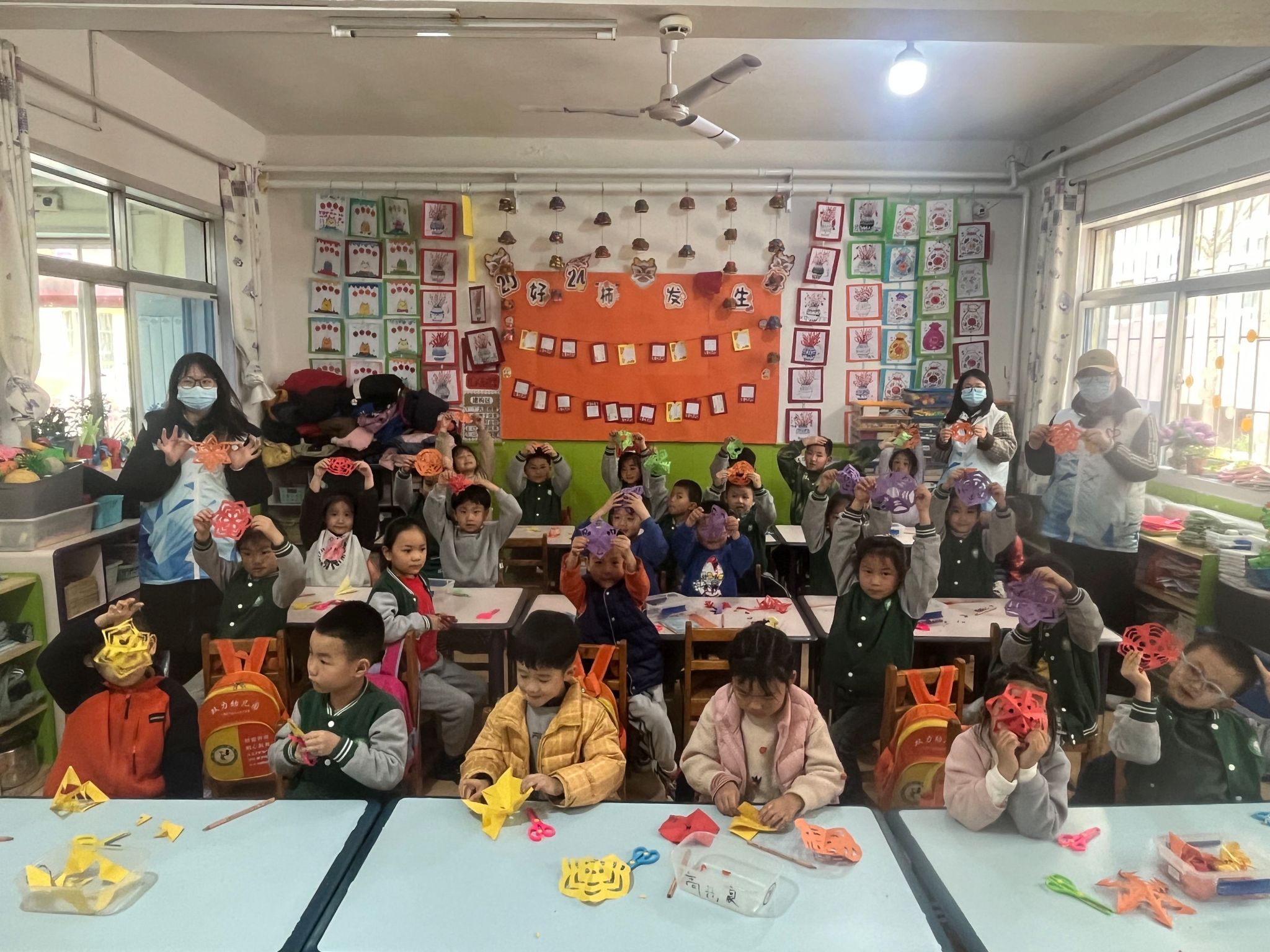 活动现场,护理系23级婴幼儿托育与服务管理班团支部的志愿者向小朋友们详细介绍了剪纸的起源、发展历程、分类与工序、造型方法等方面的知识,细致地演示纸张折叠和花纹描绘等剪纸步骤,逐一示范不同图案的不同剪法。小朋友们十分好奇,跃跃欲试,志愿者手把手的指导小朋友剪纸,不一会儿,手中的一张张普通的彩色方纸变成了一个个精美的图案,小朋友们洋溢着自豪的微笑。