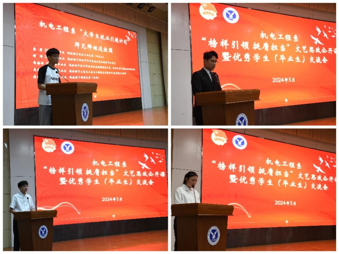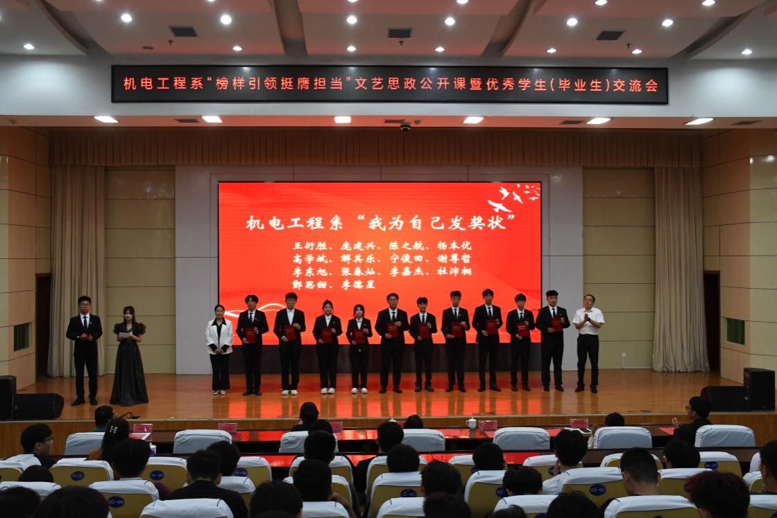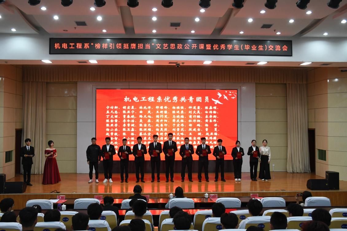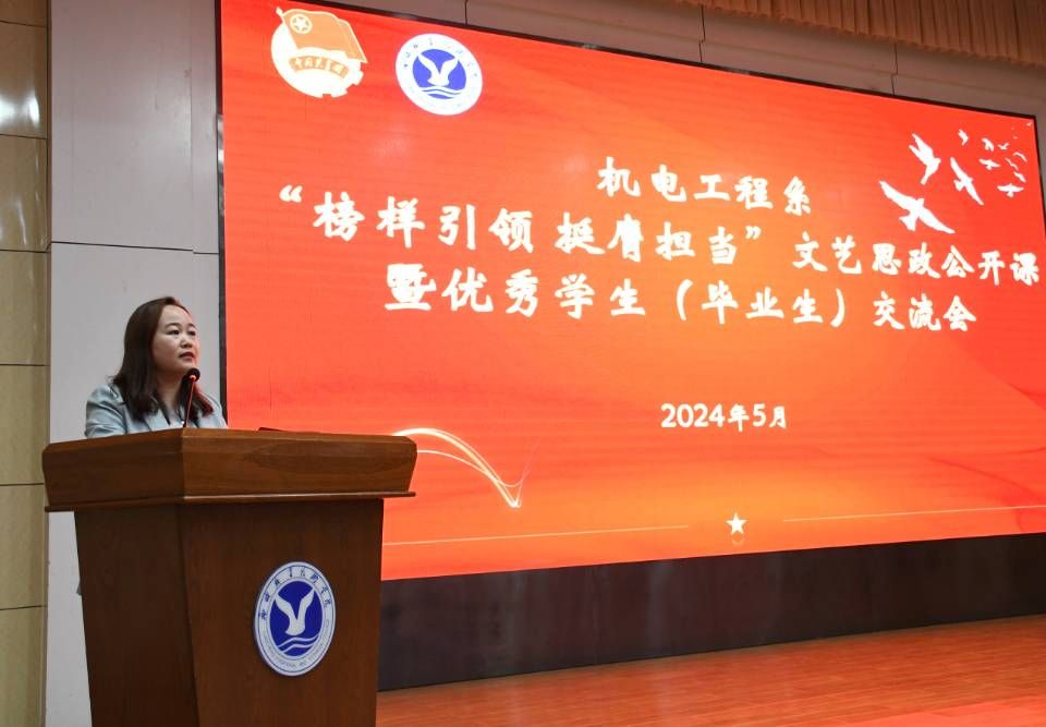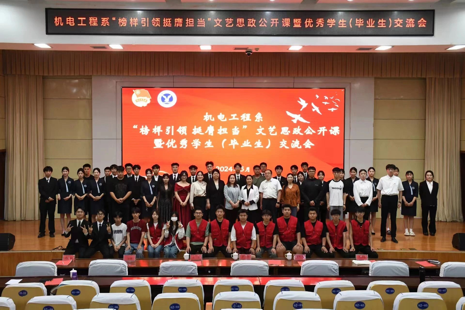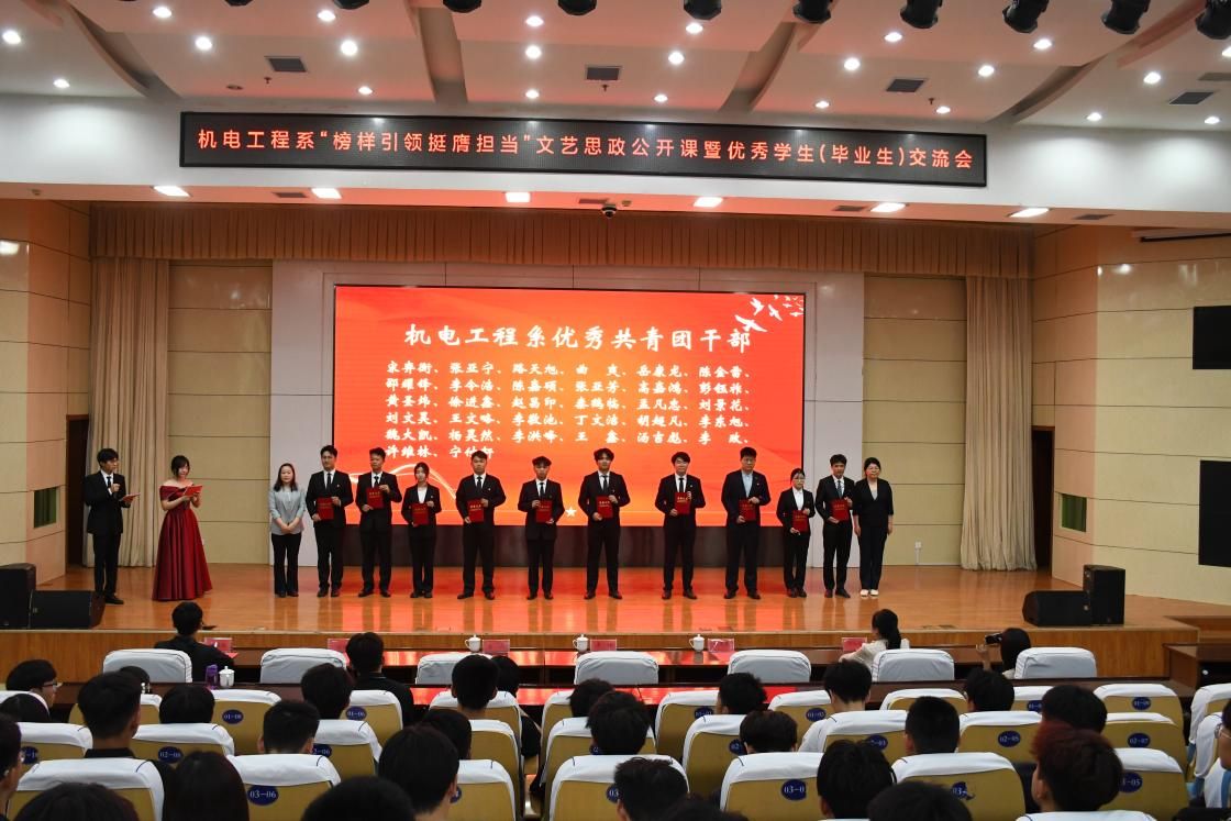 为深入贯彻和践行“爱国、进步、民主、科学”的五四精神,弘扬社会主义核心价值观,激发广大青年的奋斗热情,进一步表扬先进,树立榜样,充分发挥青年骨干的模范带头作用,5月16日,机电工程系开展“榜样引领,挺膺担当”文艺思政公开课暨优秀学生(毕业生)交流会。学校学生工作部副部长李林,心理健康教育中心副主任袁晶,机电工程系党总支书记、系主任张凤军,党总支副书记任伟,团总支副书记刘丽敏,学工组长谢兵锐,各辅导员以及学生代表共300余人参加。