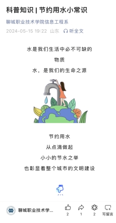 进行节约用水网络宣传。通过微信公众号、班级群等网络载体,向全系师生宣传、普及节约用水的知识,增强广大师生对保护水资源的意识。