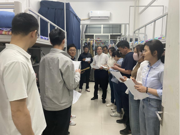 任伟给班主任讲解开展此次宿舍安全、卫生检查的必要性以及重要性,重点针对学生宿舍楼道供电安全、违规电器、内务卫生等情况进行检查。检查过程中,辅导员、班主任深入每间宿舍,并进行评分,老师们也相互交流探讨宿舍管理经验,取长补短,进而把班级工作做得更好。