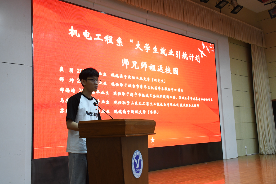 为深入贯彻《2024年山东省大学生就业引航计划工作指引》要求,全面落实大学生就业工作安排,引导大学生立足实际、找准定位,树立正确的择业观、就业观,5月16日,机电工程系在南校区图书馆报告厅开展“师兄师姐返校园”交流活动,2021届优秀毕业生代表崔萌(在读研究生代表)、邵帅(机关事业单位),马庆昕(技术工程师),2023届优秀毕业生代表苏继鹏(在读本科生代表)进行交流分享,300余名在校生参加活动。