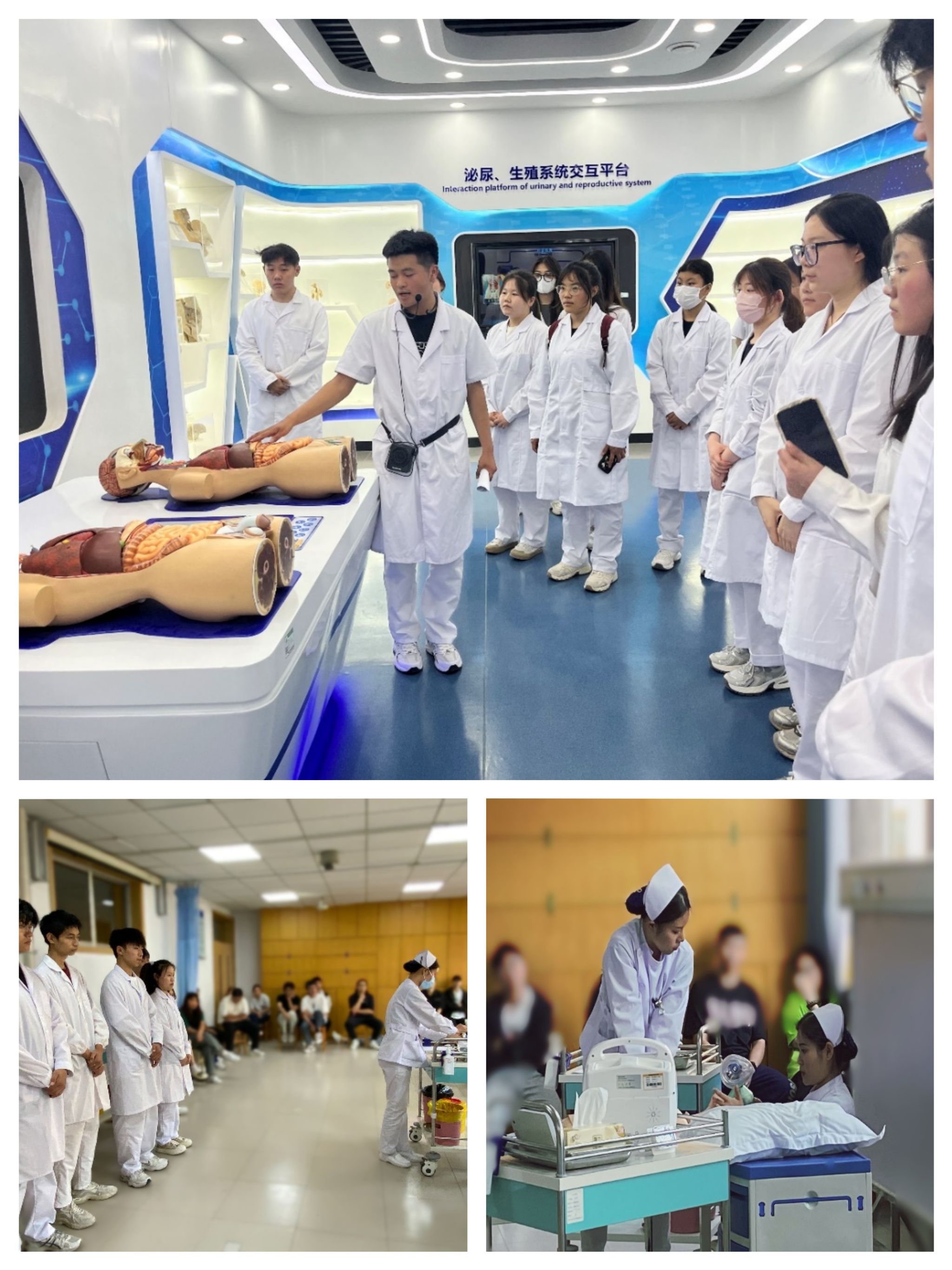 理论学习结束后,团员青年们第一站来到生命与健康科学馆,开启了生命探索之旅。由解密生命、精妙人体、健康互动体验组成的三大展区,让学生们全方位、多维度地了解了生命科学、健康促进、公卫卫生等科普知识。在生命与健康科学馆的沉浸式体验中,让同学们感受到了生命的奥妙、技能的宝贵,增强了广大团员青年要技能成才、技能报国的责任感和使命感。团员青年们第二站来到护理系实训室,观摩了护理技能大赛的备赛过程。参赛选手通过心肺复苏、测量血压、静脉输液和心电图测量的演示,展示了扎实的专业技能和良好的职业素养。