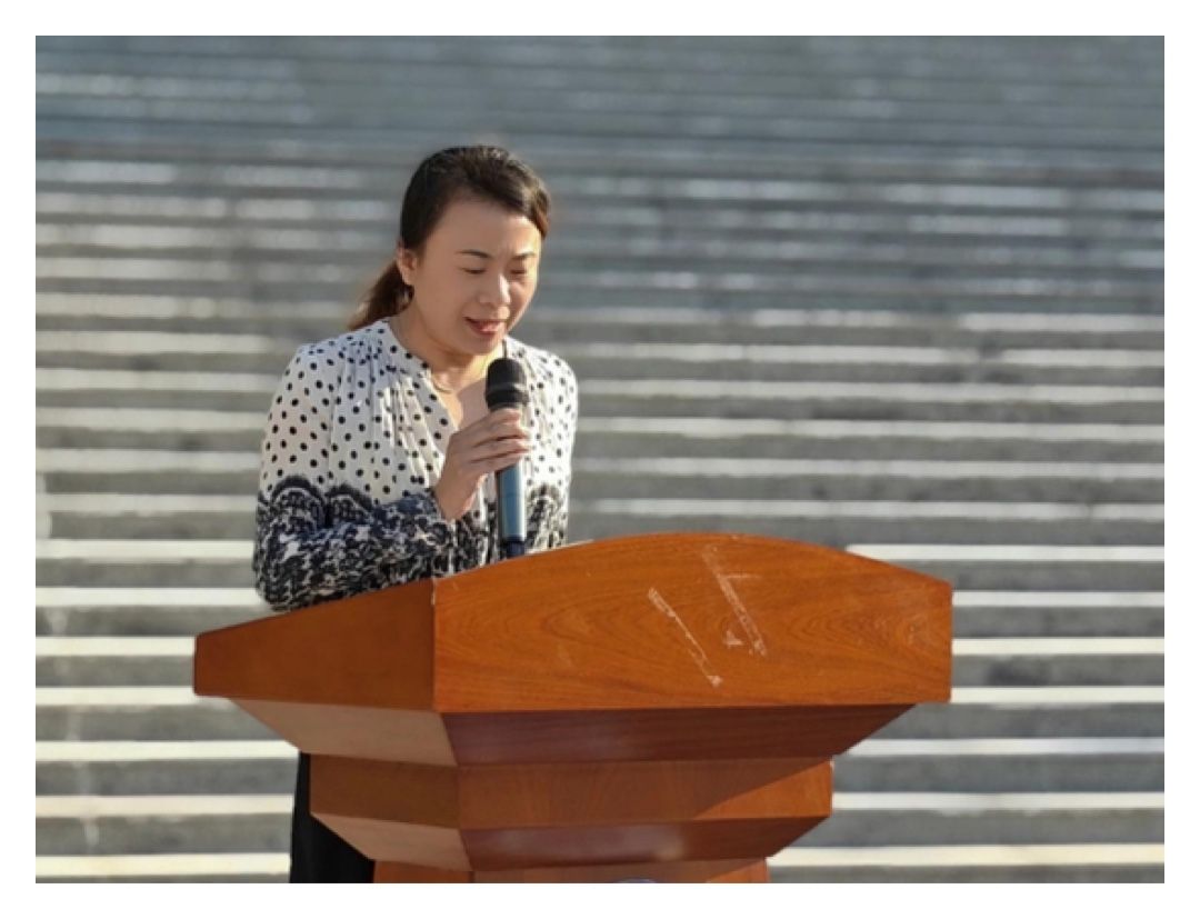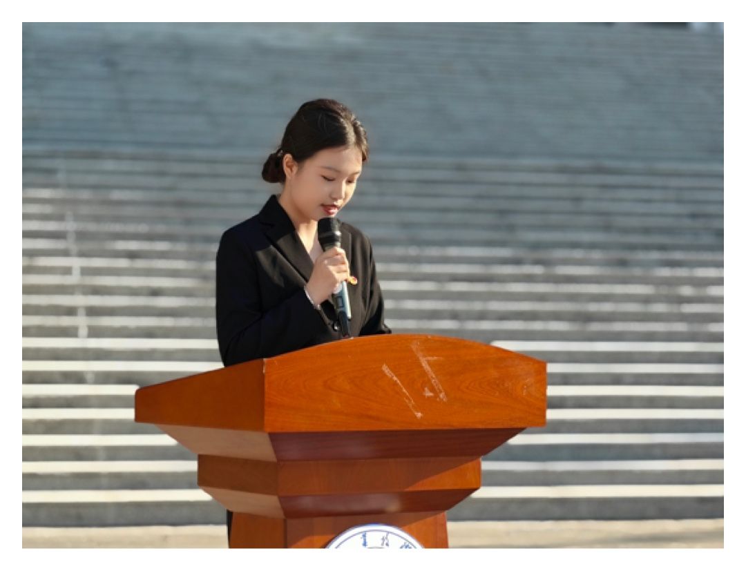 学生代表孟欣悦发言,表达了青年一代对国家的深情厚谊和对未来发展的美好憧憬。她呼吁同学们要勇于承担历史使命,敢于追梦圆梦,用青春和汗水书写无愧于时代的精彩篇章。