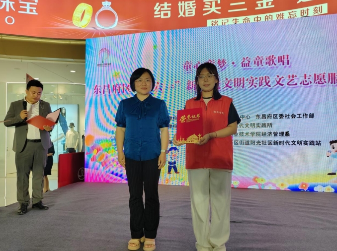 活动当天,志愿者们根据工作安排部署,准时到达活动现场进行环境布置,志愿者们统一着装、组织有序、干劲十足,配合社区工作人员,有序搬运物资、摆放桌椅、整理物品,将现场布置得井然有序,为参演嘉宾和观众营造了一个干净、舒适的环境。在儿童文艺汇演时,志愿者们主要负责活动现场秩序维护、舞台布置和参演儿童指引等工作,他们认真负责的态度赢得了活动参与者的一致赞赏。为表彰经济管理系在阳光社区“益童歌唱”公益音乐课堂项目中的志愿服务工作,在活动颁奖环节授予了“文明实践最美志愿单位”荣誉称号。