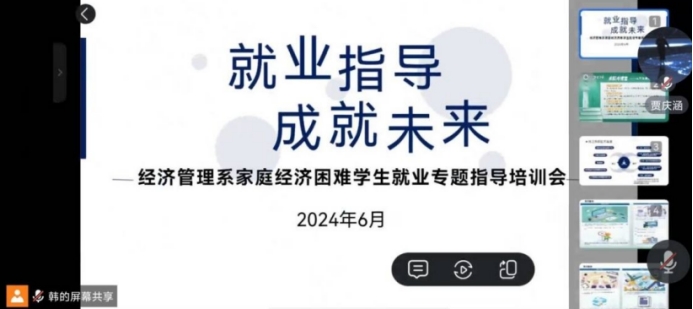 为贯彻落实教育部“宏志助航”计划,进一步提升经济管理系家庭经济困难学生就业能力和综合素质,6月12日,经济管理系举办“家庭经济困难学生就业专题指导培训会”,培训会分为线上和线下2个会场,2021级学生通过腾讯会议在线上参加培训,2022级学生集中在1-3会议室参与培训。