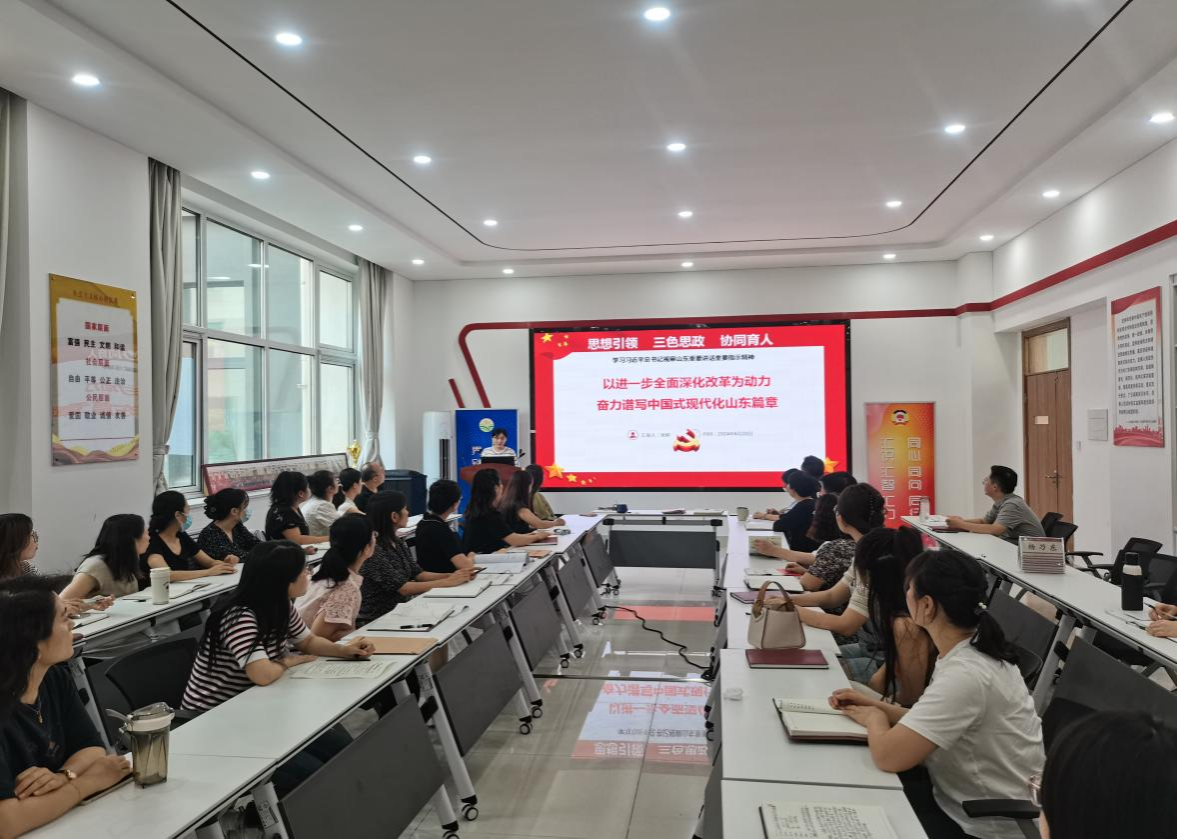 6月20日,马克思主义学院开展“思想引领 三色思政 协同育人”行动,组织全体党员教师学习习近平总书记视察山东重要讲话重要指示精神。本次活动主讲由党员教师张婷担任。