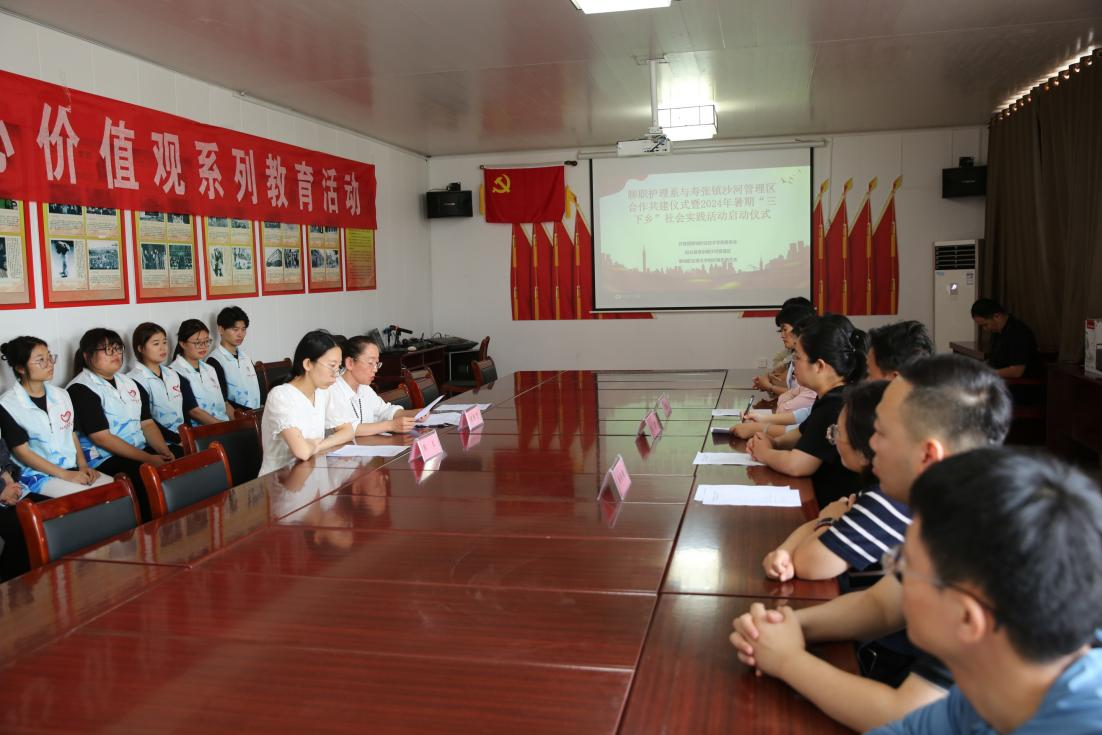 实践团第一站来到了沙河崖村村委会,召开护理系与寿张镇沙河管理区合作共建仪式暨2024年暑期“三下乡”社会实践启动仪式。仪式上,护理系团总支张翠翠对护理系学生社会实践情况进行了简单介绍,学生代表秦鲁萌代表同学们做了表态发言。护理系团总支副书记杨清刚与沙河管理区副主任赵秋芝一同签订了合作共建协议。