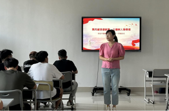 辅导员李春燕以“躬身前行,挺膺担当——如何做一名优秀学生干部”为主题,为学生干部们上了一堂生动的教育课。李老师结合自己多年的工作经验,从责任感、执行力、团队协作等多个方面阐述了优秀学生干部的必备素质。她鼓励学生干部们要勇于担当,积极作为,用实际行动践行服务师生的誓言。