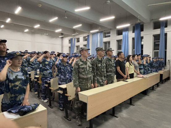 “我将牢记习近平总书记嘱托,听党指挥,忠诚不渝……挺膺担当!强军有我!强国有我!”2024级全体新生进行开训宣誓。经贸学院2024级新生军训动员大会在雄壮的《中国人民解放军军歌》中落下帷幕。