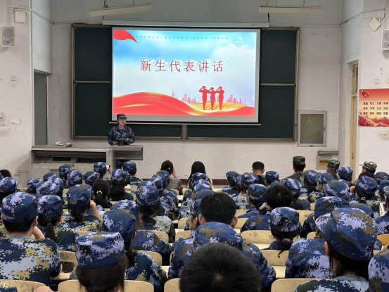新生代表沈浩然发言。她承诺和全体参训学生将在军训中严守纪律、确保安全,刻苦训练、力争上游,团结同学、互帮互助,以饱满的热情和坚定的信念全力完成此次军训任务。