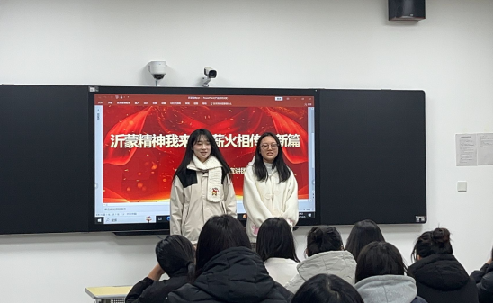 活动在宣讲团范辰源和吴佳峻的《颂沂蒙》诗歌朗诵中开始。朗诵感情充沛,声音洪亮,赞颂了革命年代波澜壮阔、感人至深的军民“水乳交融、生死与共”的沂蒙精神,同学们被沂蒙感动,无不认真聆听,沉浸其中,并时而报以热烈的掌声。