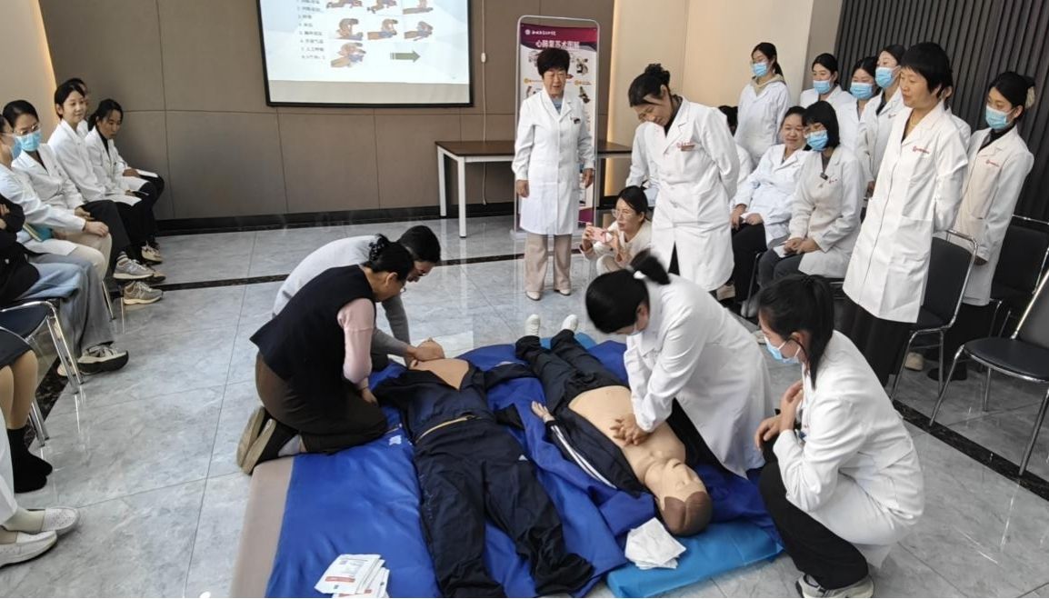 在体检中心,师生受到了热情的接待。健康护理学院健康管理教研室主任孙志强老师为体检中心50余名工作人员现场讲解了心肺复苏的重要性和操作流程。随后,他邀请工作人员利用心肺复苏模拟人进行了模拟实操,操作中,他详细讲解每个步骤的要点和注意事项,确保参训员工能够全面理解和掌握。现场人员认真听讲、积极响应、纷纷主动尝试。