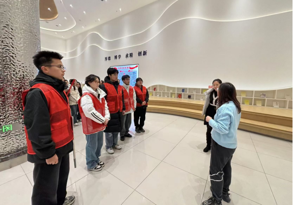 图书馆段艳英老师向宣讲团成员介绍了图书馆的馆藏资源、区域功能、朗读亭使用等,着重介绍了《沂蒙母亲》《沂蒙精神》《忆沂蒙》等相关书籍及馆藏分布。学生来到三楼冀鲁豫历史文化长廊,驻足观看了冀鲁豫边区的革命历史,聆听讲解员讲述在革命战争时期涌现的革命先辈的英雄事迹,感悟革命精神的伟大。宣讲团成员走进朗读亭,用饱含深情的语调朗读“沂蒙红嫂”“沂蒙母亲王换于”“沂蒙六姐妹”等先辈的感人事迹,用声音传递红色故事,缅怀英雄,铭记历史。