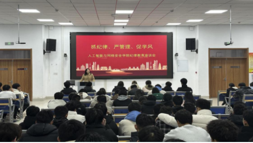 加强纪律教育,筑牢思想防线。为进一步加强学生的纪律观念,切实提高学生的纪律意识,人工智能与网络安全学院组织召开纪律教育座谈会,团总支书记王哲、全体辅导员老师及学生代表参加。王哲老师结合学生处分案例,讲解各类违纪行为带来的后果,引导学生树立正确的行为观念。希望同学们珍惜大学时光,树立规矩意识,努力提高个人素养,以更加饱满的热情和更加坚定的信念投入到学习中去。