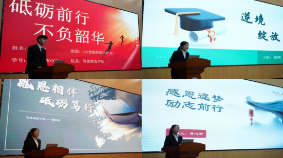 获得国家励志奖学金、国家助学金的优秀学子们展示了以“励勤奋之志,怀感恩之心”为主题的自制短视频,并现场讲述他们大学期间的成长历程与奋斗故事,发挥朋辈励志榜样作用,营造知恩感恩氛围,传递“奋发图强、感恩前行、励志成才”的青春正能量,助力同学们更好地规划未来的生涯路径。