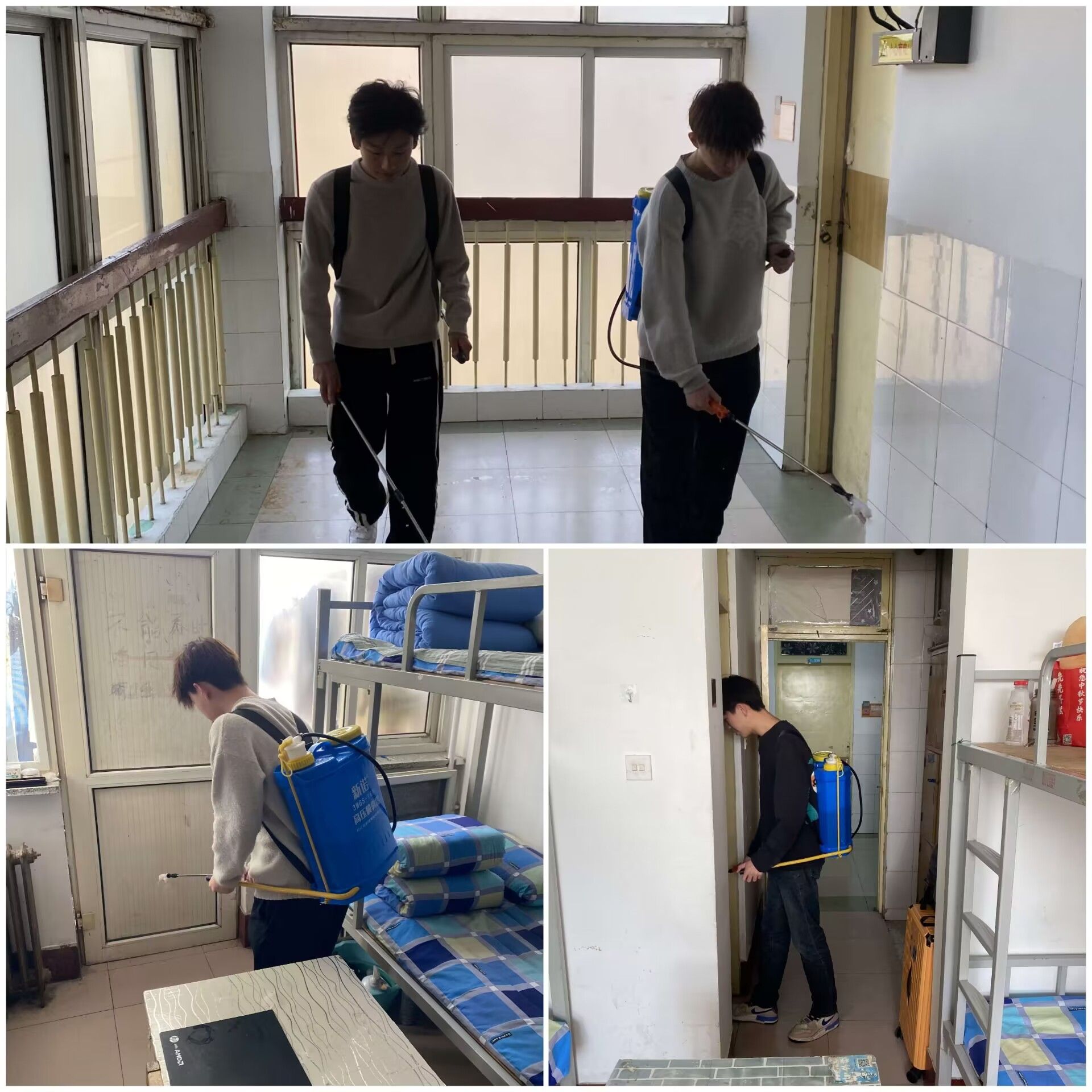 在消杀过程中,卫生部工作人员严格按照卫生消杀标准规范操作,对教室、宿舍内的各个区域进行了细致的消毒处理。他们手持喷雾器,对床铺、桌椅、门窗把手、卫生间等高频接触的物体表面喷洒消毒药水,确保消杀工作全覆盖、无死角。教室和宿舍走廊、楼梯间等公共区域也同样进行了彻底的清洁与消毒,有效阻断了病菌传播途径。