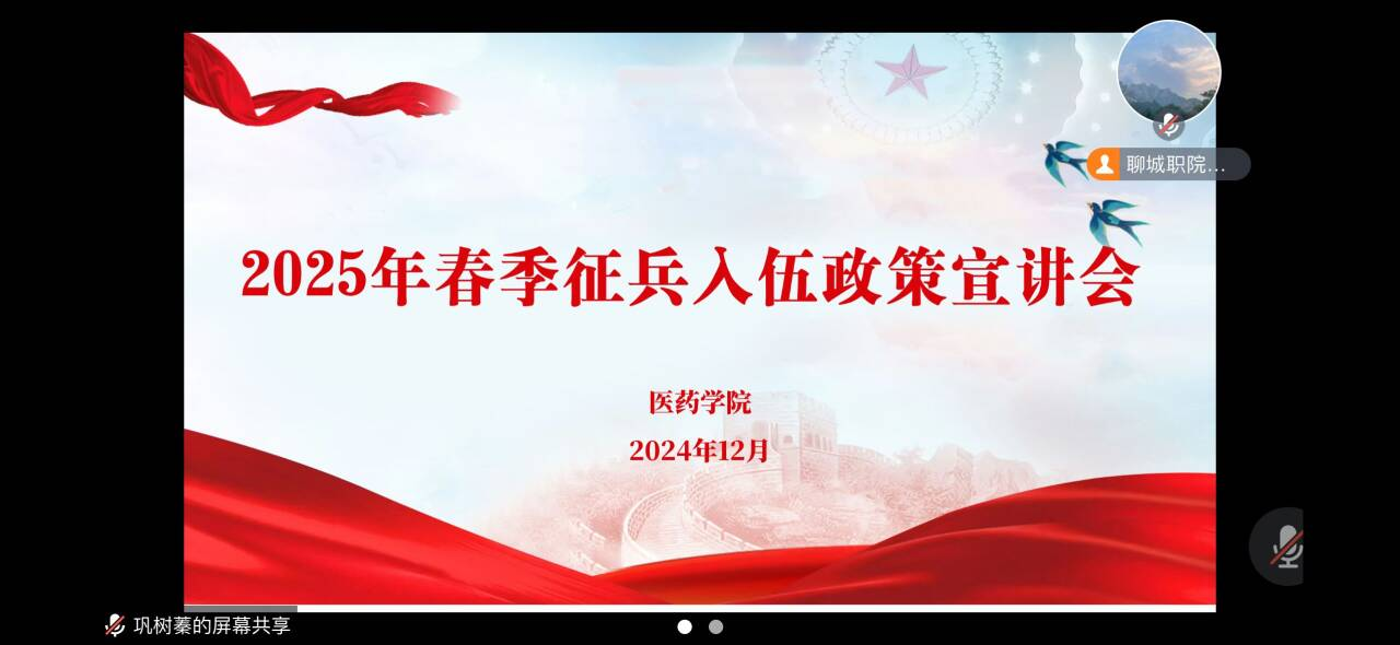 为扎实推进2025年春季征兵入伍工作,加深有志青年对应征入伍政策的认知,12月21-22日,医药学院针对毕业生、在校生分别召开应征入伍政策宣讲,200余名学生积极参加。