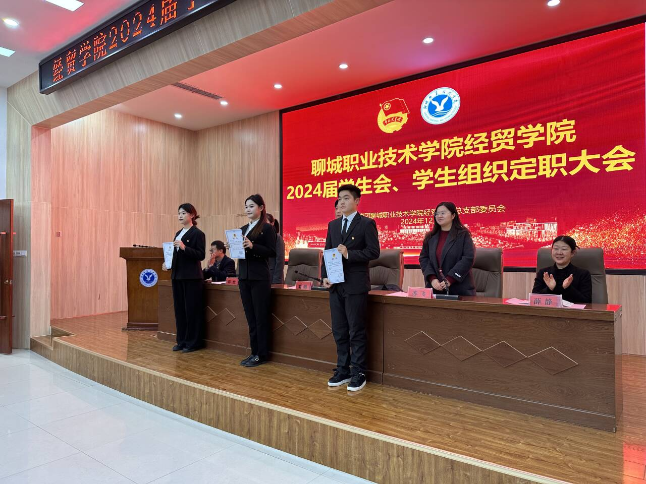为进一步加强学生干部队伍建设,明确学生会、学生组织各部门职责,提高学生组织的凝聚力和工作效率,12月24日,经贸学院召开2024 届学生会、学生组织定职大会。聊城职业技术学院学生工作部栾鹏、经贸学院团总支副书记苏飞、学工组长郭怡、全体辅导员、2024届学生会及学生组织负责人参加活动。会议由苏飞主持。