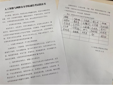 签订诚信倡议书。各班签订了《人工智能与网络安全学院诚信考试倡议书》,通过签署承诺书,深化诚信观念,引导学生自觉遵守考试纪律。同学们纷纷表示,将以此次活动为契机,持续磨砺自我约束的意志品质,不断提升学习的自觉性与主动性,以严谨认真的态度对待每一次考试。