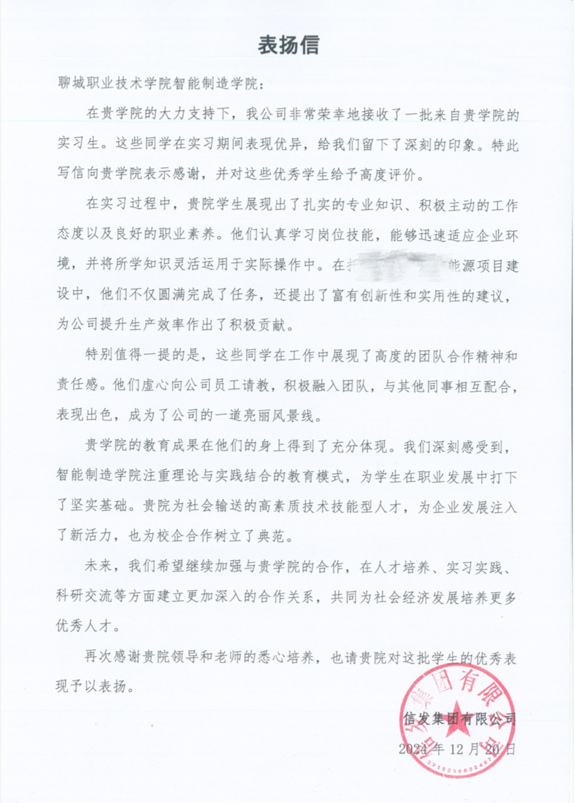 近日,一封饱含赞誉的表扬信从信发集团有限公司寄至聊城职业技术学院智能制造学院,这封表扬信是对校企合作成果的高度认可,更是企业与高校携手共进、共育英才的生动注脚。