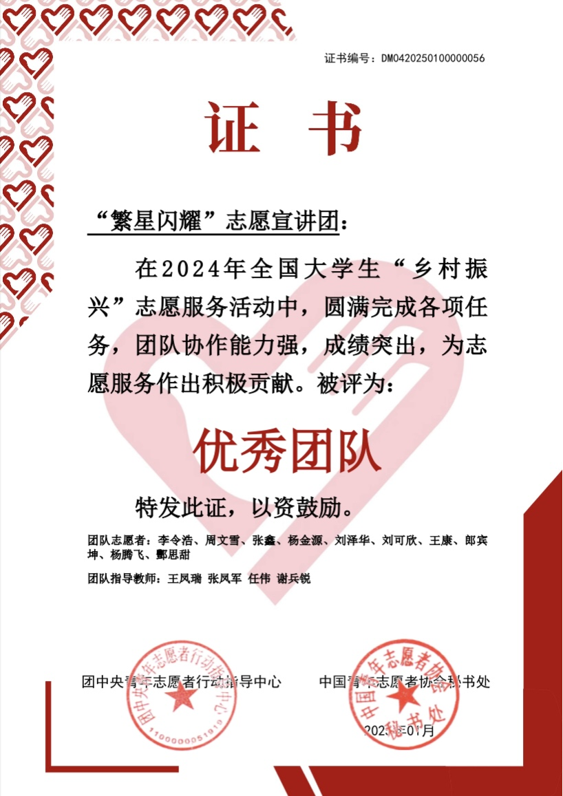 近日,团中央青年志愿者行动指导中心、中国青年志愿者协会秘书处公布了2024年全国大学生“乡村振兴”志愿服务活动优秀团队名单,聊城职业技术学院智能制造学院“繁星闪耀”乡村振兴志愿宣讲团荣获2024年全国大学生“乡村振兴”志愿服务活动“优秀团队”。