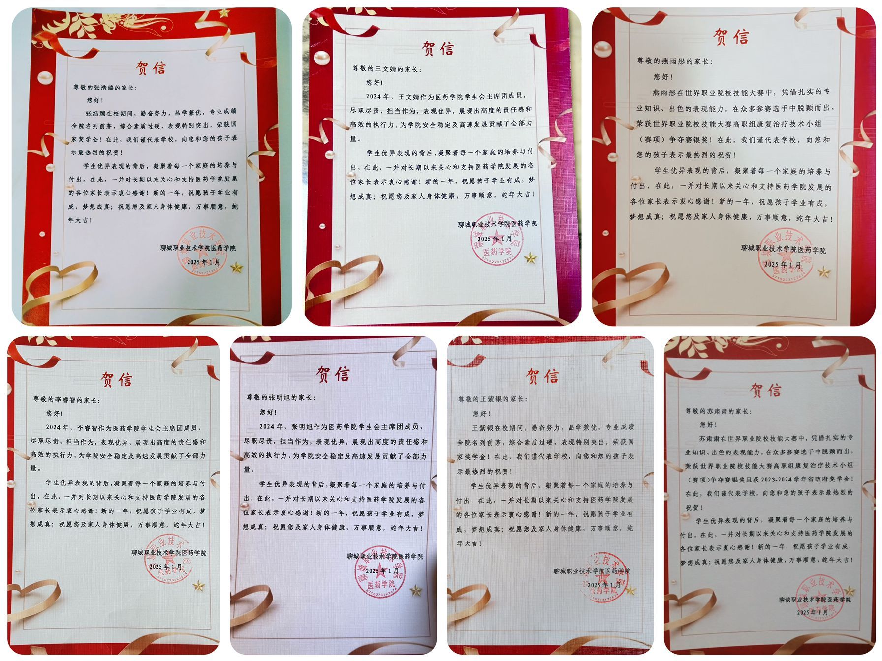 为有效发挥榜样引领作用,推进家校联动,形成育人合力。近日,医药学院开展“贺信传佳音 家校共育人”活动,为国家奖学金获得者、省政府奖学金获得者、世界职业院校技能大赛和山东省职业院校技能大赛获奖者、学生会主席团成员等共计24名学生邮寄贺信,向家长分享学生在校成长的收获与喜悦。