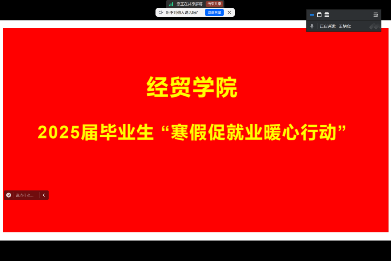 为提升学生就业竞争力,帮助学生从容应对就业挑战,经贸学院各毕业班级班主任在寒假期间召开了“寒假促就业暖心行动” 就业指导主题班会。