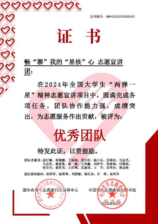 为深入学习宣传贯彻习近平新时代中国特色社会主义思想和党的二十大精神,落实“强国复兴有我”群众性主题宣传教育活动相关要求,纪念中国第一颗原子弹成功爆炸60周年,引导青年学生大力弘扬“两弹一星”精神,团中央青年志愿者行动指导中心、中国核工业集团有限公司联合发布了《关于遴选2024年全国大学生“两弹一星”精神志愿宣讲团的公告》。聊城职业技术学院智能制造学院畅“聊”我的“星核”心志愿宣讲团凭借出色表现,圆满完成宣讲任务,从立项的1000支团队脱颖而出,荣获“优秀团队”荣誉称号,成为全国获此荣誉的100支队伍之一。