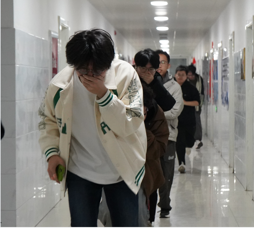 演练前,学院多渠道宣传消防应急演练任务与注意事项,充分做好准备。演练开始,两声警报先后响起,第一声后同学们迅速用湿毛巾捂口鼻,第二声后听从指挥,弯腰捂鼻按预定路线有序撤离,各宿舍依次疏散,5分钟内安全到达北校区3号宿舍楼后的指定地点。过程中,疏散组组织疏散,班级负责人清点名单,护卫组引导同学避开危险并统计人数,搜救组检查楼层防遗漏,医疗组随时待命,后勤组负责应急物资采购搬运。